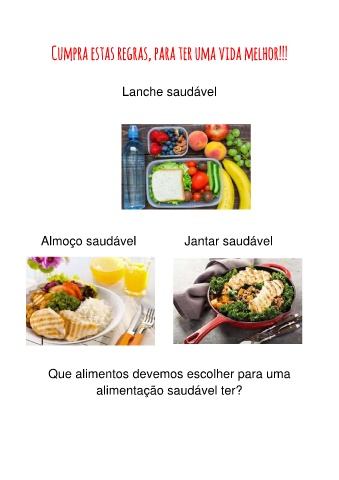 Cumpra estas regras, para ter uma vida melhor!!! Lanche saudável Almoço saudável Jantar saudável i Que alimentos devemos escolher para uma alimentação saudável ter?