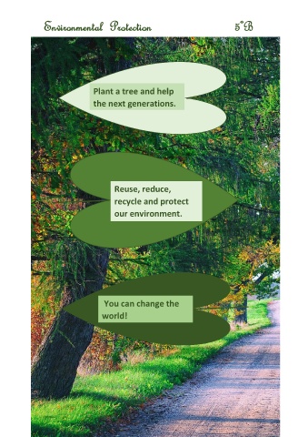 Environmental Protection 5ºB Plant a tree and help the next generations. Reuse, reduce, recycle and protect our environment. You can change the world!