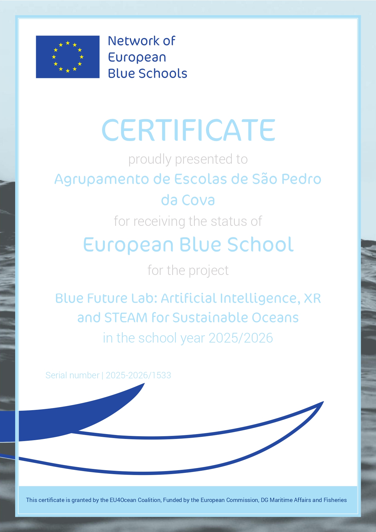 O Agrupamento de Escolas de São Pedro da Cova acaba de ser oficialmente reconhecido pela Rede de Escolas Azuis Europeias (European Blue Schools) para o ano letivo 2025/2026. Esta distinção internacional premeia o trabalho desenvolvido no âmbito do projeto "Blue Future Lab: Artificial Intelligence, XR and STEAM for Sustainable Oceans".