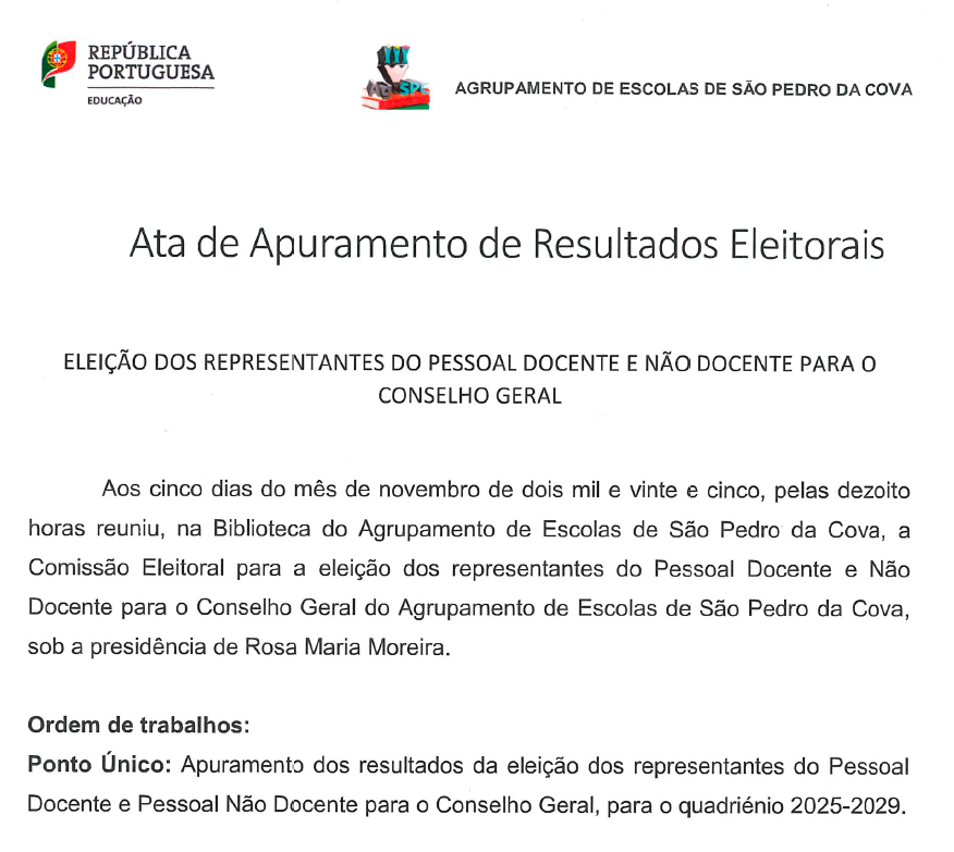 Informa-se toda a comunidade educativa que já se encontra disponível a Ata de Apuramento dos Resultados Eleitorais referente à eleição dos representantes do pessoal docente e não docente para o Conselho Geral.