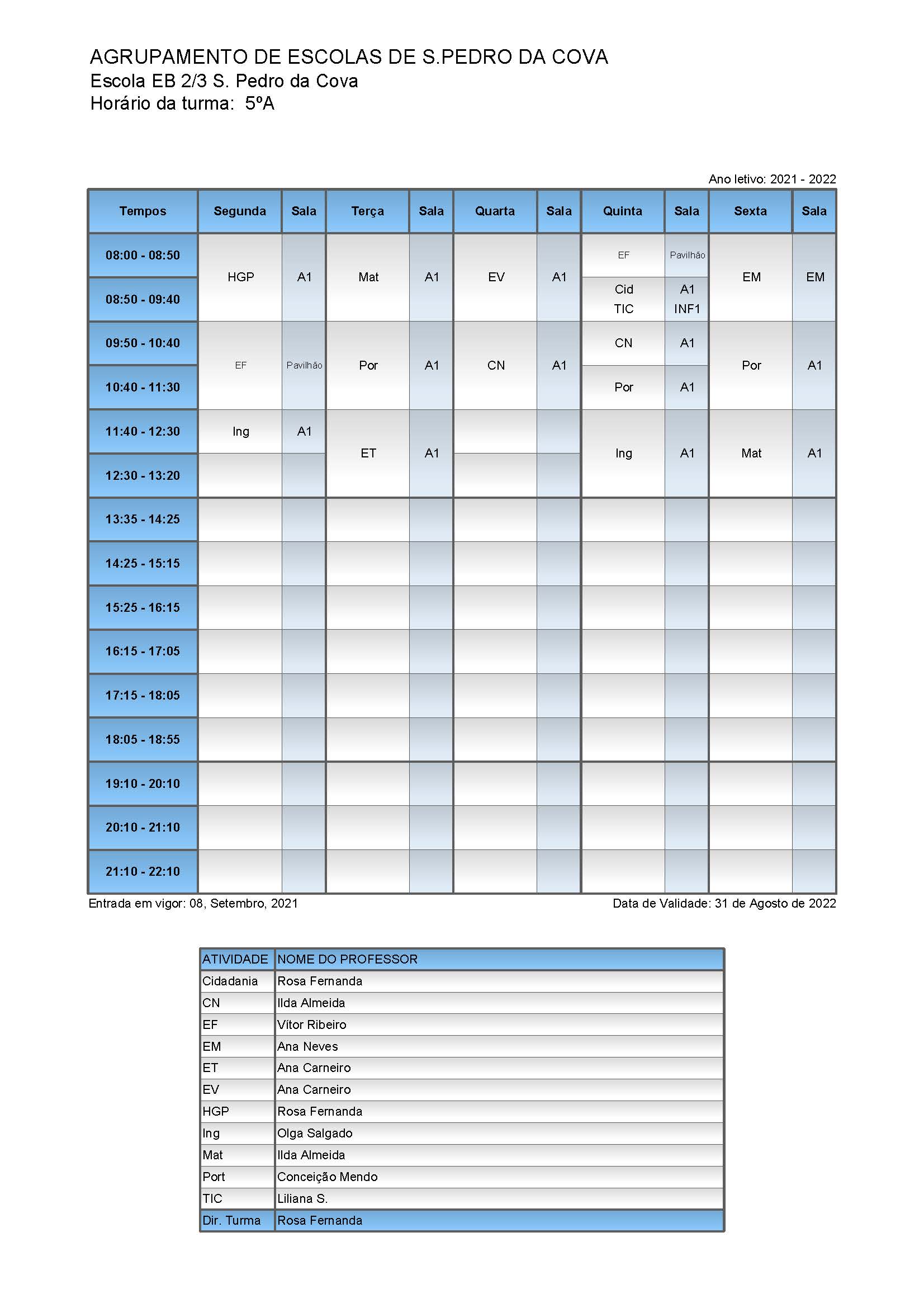 Para visualizar, clique em Horários 2021/2022 ou no menu superior "Aluno e Pais" e no item "Horários".