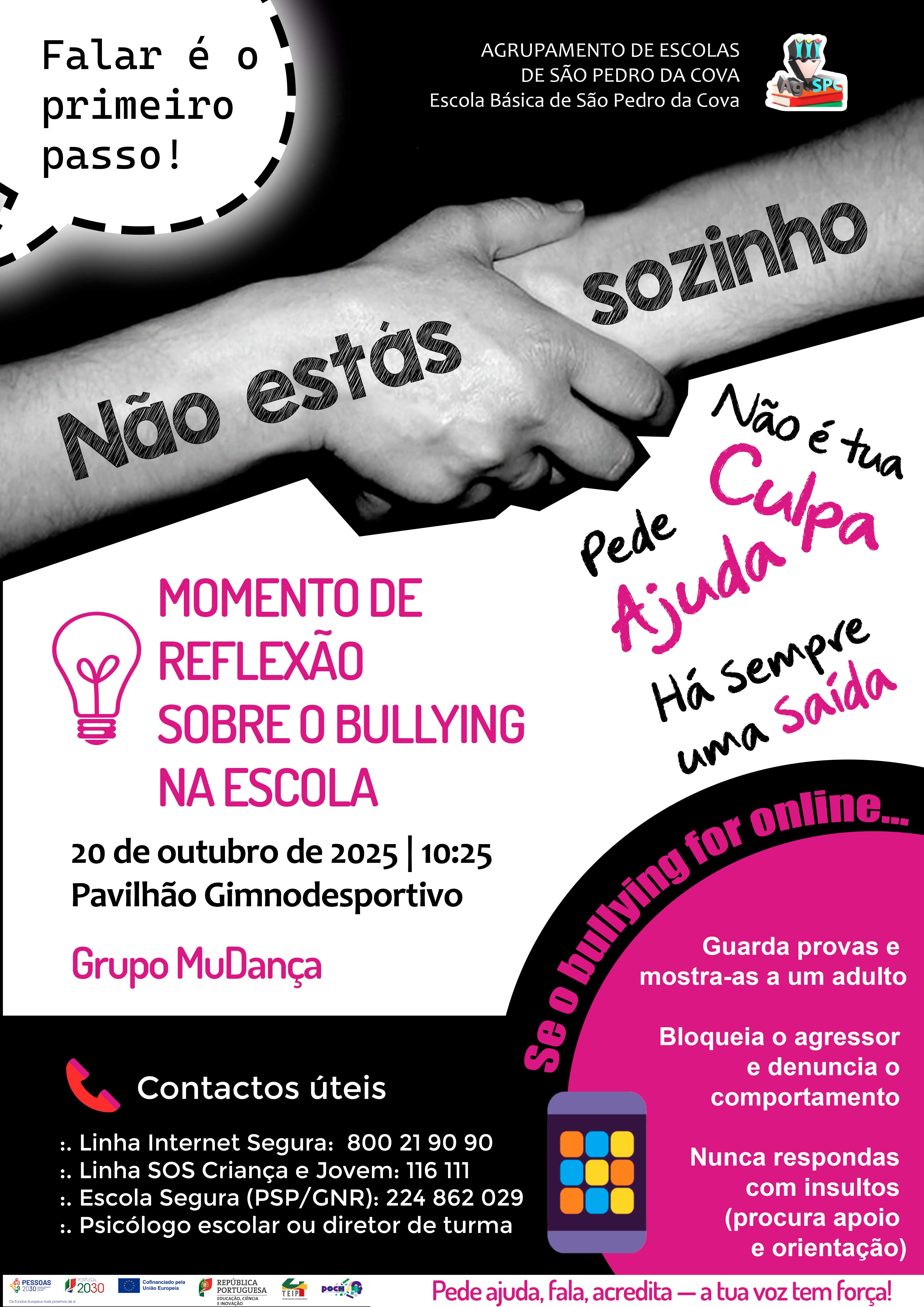 No âmbito de outubro ser o mês dedicado à prevenção e combate ao Bullying e ao Cyberbullying, o Agrupamento de Escolas de São Pedro da Cova, através das professoras Natércia Romano e Telma Neto, promove uma atividade que integra uma estratégia coordenada de promoção de uma cultura de respeito e de criação de um ambiente escolar seguro.