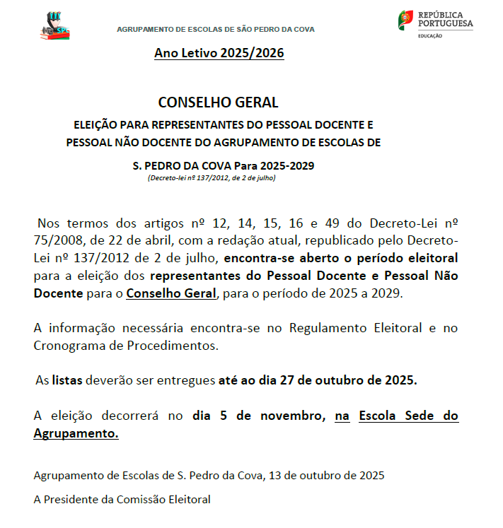 Nos termos dos artigos nº 12, 14, 15, 16 e 49 do Decreto-Lei nº 75/2008, de 22 de abril, com a redação atual, republicado pelo Decreto- Lei nº 137/2012 de 2 de julho, encontra-se aberto o período eleitoral para a eleição dos representantes do Pessoal Docente e Pessoal Não Docente para o Conselho Geral, para o período de 2025 a 2029.