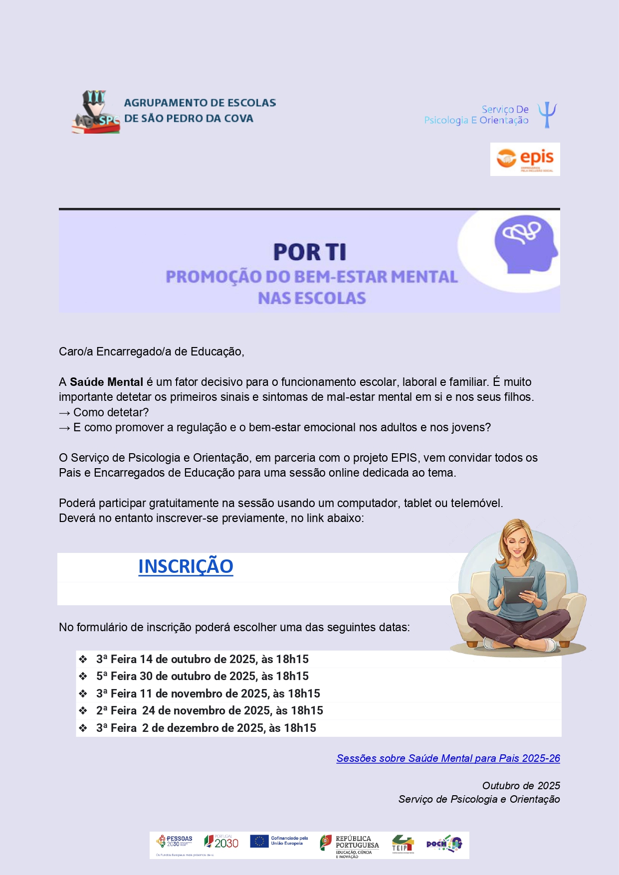 No alinhamento do Projeto de Intervenção da Diretora, cuja ação estratégica defende o propósito de se "Manter as iniciativas de formação de pais e encarregados de educação, numa perspetiva de tornar a escola um pólo de desenvolvimento da comunidade....", o Serviço de Psicologia e Orientação (SPO), em parceria com a EPIS, vem propor um conjunto de Sessões Online dirigidas aos Encarregados de Educação.