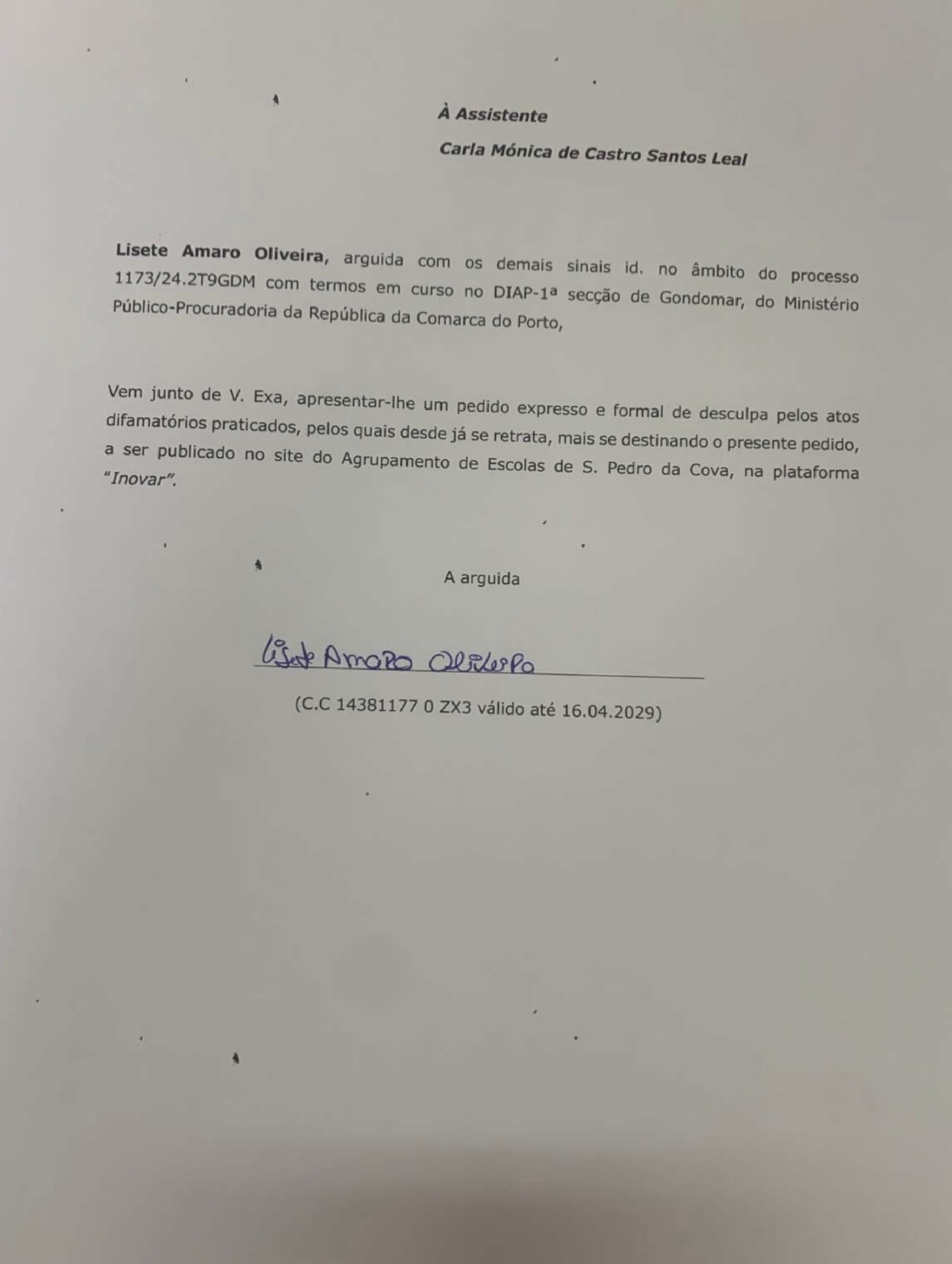 No âmbito da indicação do Ministério Público – Procuradoria da República da Comarca do Porto, DIAP – 1.ª Secção de Gondomar, e em cumprimento das condições determinadas, segue o pedido de desculpas redigido pela Senhora Lisete Amaro de Oliveira, dirigido à Senhora Dra. Carla Mónica de Castro Santos Leal.