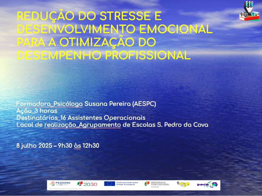 No dia 8 de julho de 2025, dinamizou uma Ação de Formação para Assistentes Operacionais do AESPC, com o tema "REDUÇÃO DO STRESSE E DESENVOLVIMENTO EMOCIONAL PARA A OTIMIZAÇÃO DO DESEMPENHO PROFISSIONAL". Os objetivos a atingir foram os seguintes: