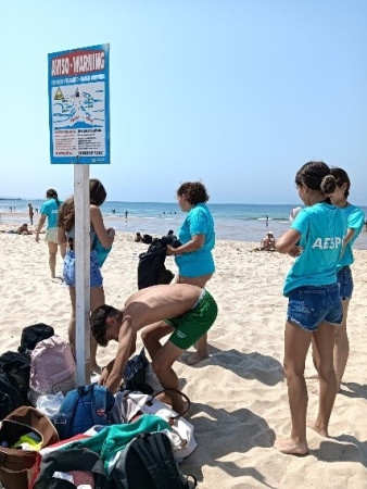 Depois, com um brilho nos olhos e um sorriso especial começa a tarefa de apanhar o lixo pela praia: plásticos, pontas de cigarro, embalagens de chicletes, papéis, vidros, restos de arames e latas de refrigerantes… há um pouco de tudo, até fraldas de bebé enterradas na areia! Os banhistas, a princípio ficam surpreendidos, muitos pensarão “Estas miúdas e estes miúdos – e já agora os professores – têm coragem. Não têm vergonha de estar a apanhar o lixo que os outros deixam!”. E então, surpreendidos, alguns fazem perguntas, “de onde vêm?”, “porque estão a fazer isto?”. Depois das explicações dadas e, já sem surpresa, outros começam a reunir o lixo à sua volta e vêm entregar-nos com um “obrigado”, até um pouco envergonhado.