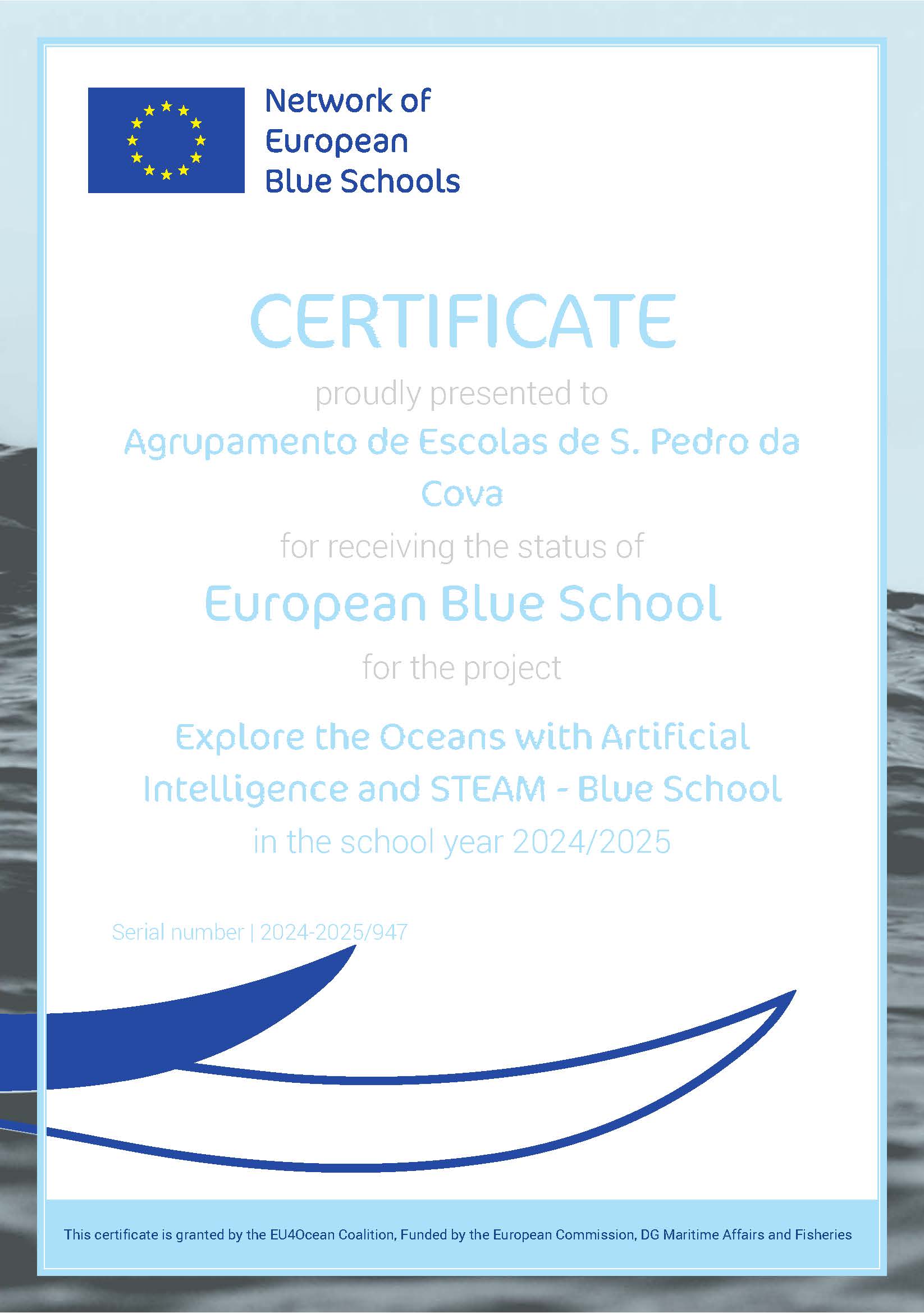 No âmbito do projeto eTwinning intitulado "Explore the oceans with Artificial Intelligence and STEAM - Blue School", alguns alunos do 8ºC e 9ºF, do Agrupamento, contribuíram ativamente para a obtenção do prestigiado Certificado Escola Azul no ano letivo de 2024-25. Este reconhecimento é um testemunho do compromisso da comunidade educativa com a educação ambiental, a sustentabilidade e a inovação pedagógica.