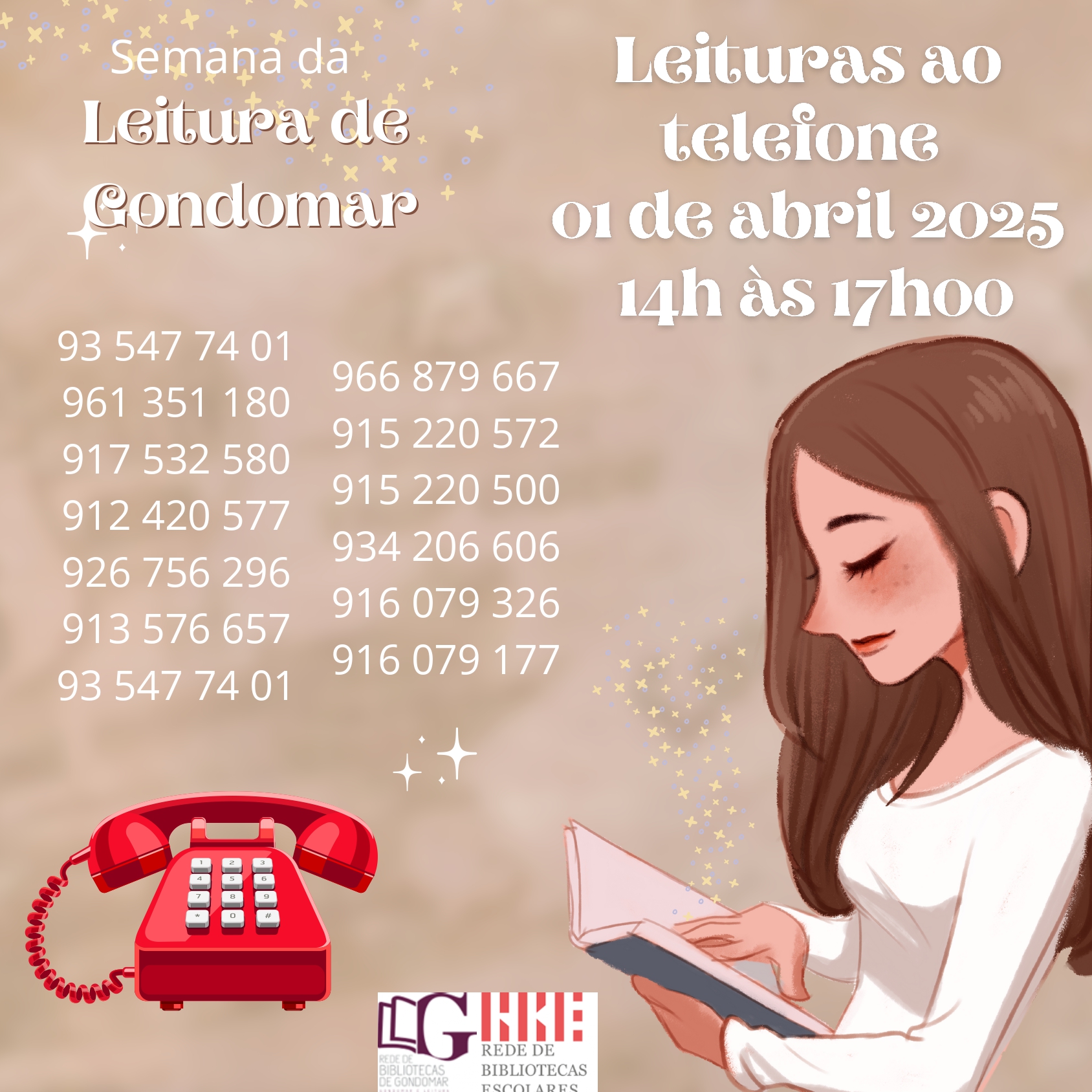 1 de abril (14h00 - 17h30) "Leituras ao Telefone" - Atividade concelhia que consiste na leitura de pequenos textos (pré-selecionados) ao telefone para a comunidade educativa - os 2 números de telefone disponíveis na nossa escola, bem como os números das outras escolas, serão afixados em vários locais do concelho de Gondomar