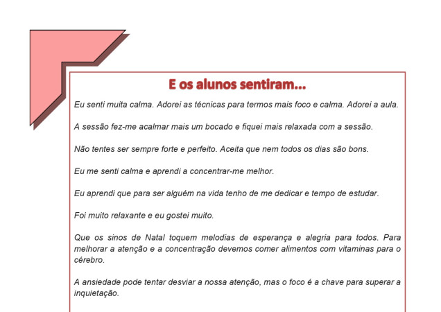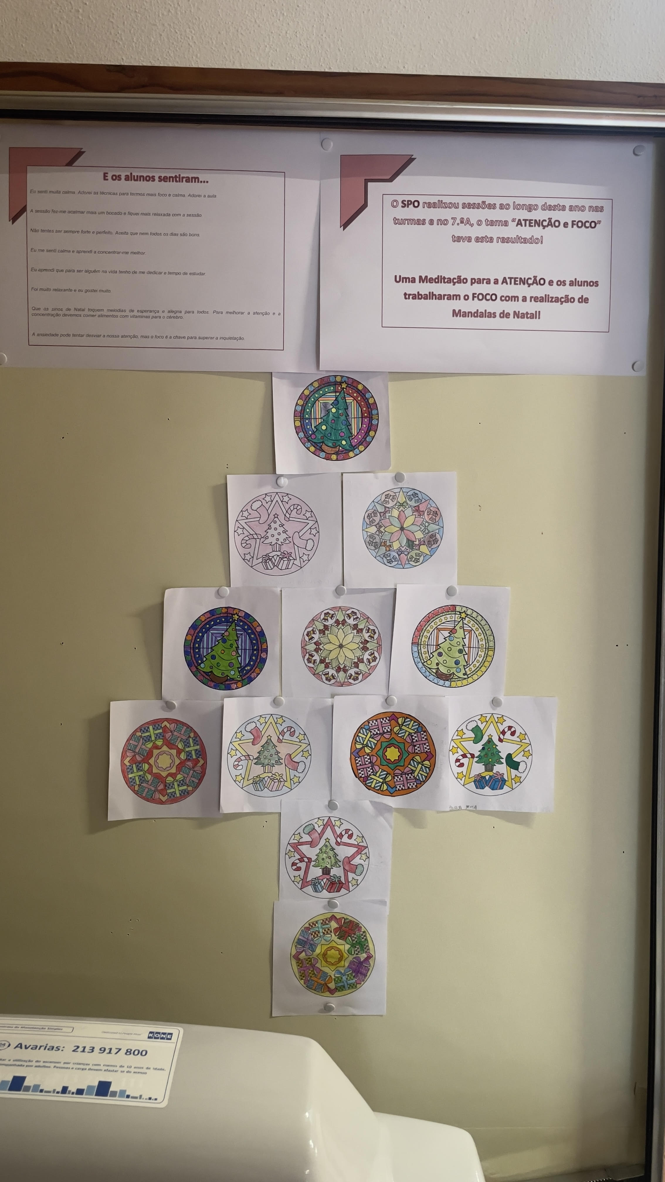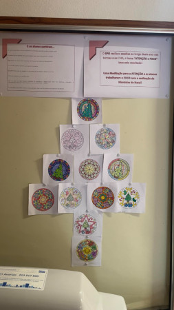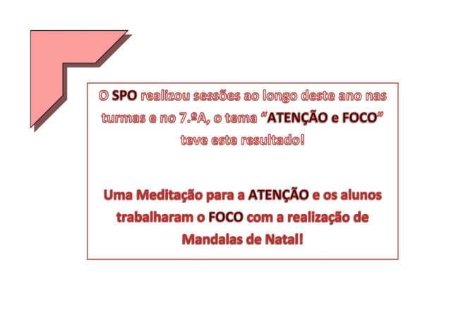 - Atenção e Foco, (esta em específico, com os alunos do 7.ºA, teve como resultado: uma meditação para a ATENÇÃO, onde os alunos trabalharam o FOCO com a realização de Mandalas de Natal enquanto ouviam, relaxavam e focavam a sua atenção!).