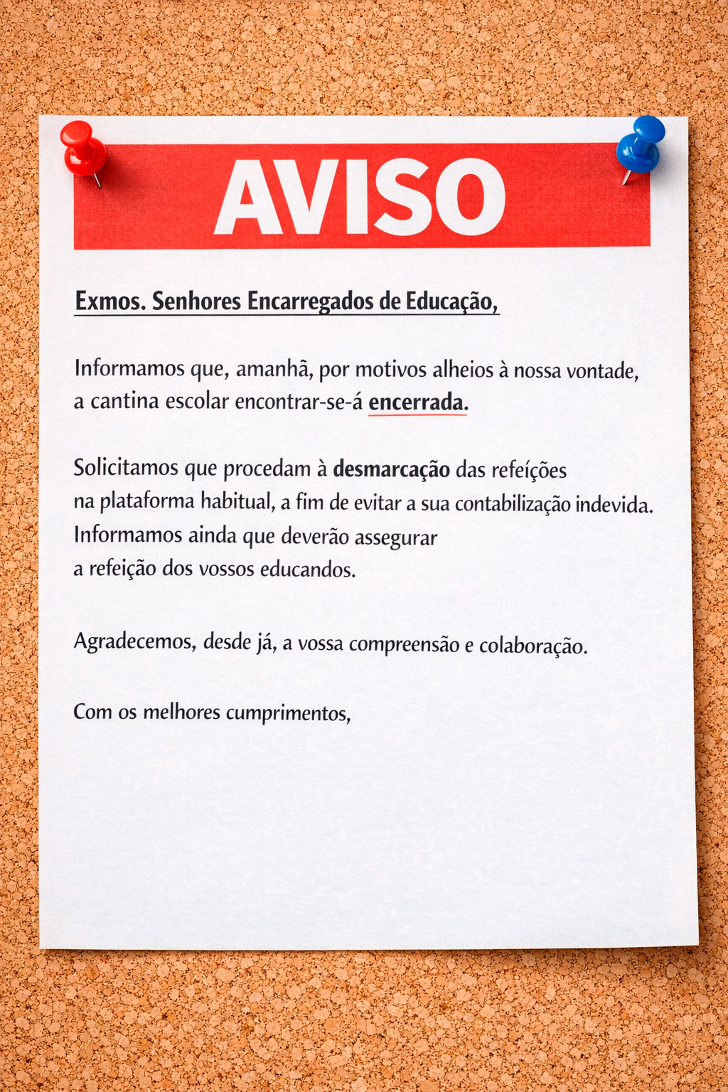 Solicitamos que procedam à desmarcação das refeições na plataforma habitual, de modo a evitar a sua contabilização indevida. Mais informamos que deverão providenciar a refeição dos vossos educandos.