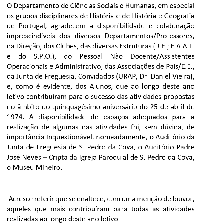 O Departamento de Ciências Sociais e Humanas, em especial os grupos disciplinares de História e de História e Geografia de Portugal, agradecem a disponibilidade e colaboração imprescindíveis dos diversos Departamentos/Professores, da Direção, dos Clubes, das diversas Estruturas (B.E.; E.A.A.F. e do S.P.O.), do Pessoal Não Docente/Assistentes Operacionais e Administrativo, das Associações de Pais/E.E., da Junta de Freguesia, Convidados (URAP, Dr. Daniel Vieira), e, como é evidente, dos Alunos, que ao longo deste ano letivo contribuíram para o sucesso das atividades propostas no âmbito do quinquagésimo aniversário do 25 de abril de 1974. A disponibilidade de espaços adequados para a realização de algumas das atividades foi, sem dúvida, de importância Inquestionável, nomeadamente, o Auditório da Junta de Freguesia de S. Pedro da Cova, o Auditório Padre José Neves – Cripta da Igreja Paroquial de S. Pedro da Cova, o Museu Mineiro.