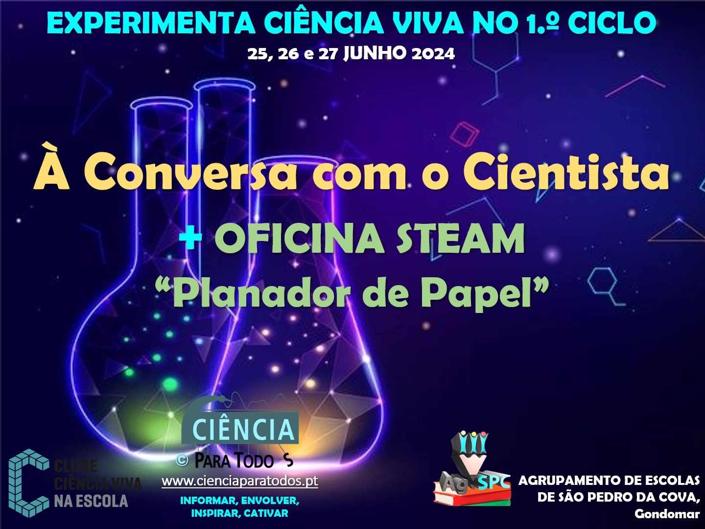 O que acontece quando o Clube CVnE e o seu inseparável parceiro de atividade PDC-CIÊNCIA PARA TODOS (www.cienciaparatodos.pt) levam um CIENTISTA às escolas do 1.º Ciclo do AESPC e desafiam MAIS DE 370 “Pequenos Exploradores da Ciência” (1.º, 2.º, 3.º, 4.º anos e, também, do pré-escolar) a colocarem questões difíceis ao Físico José Luís Santos da Faculdade de Ciência da Universidade do Porto?