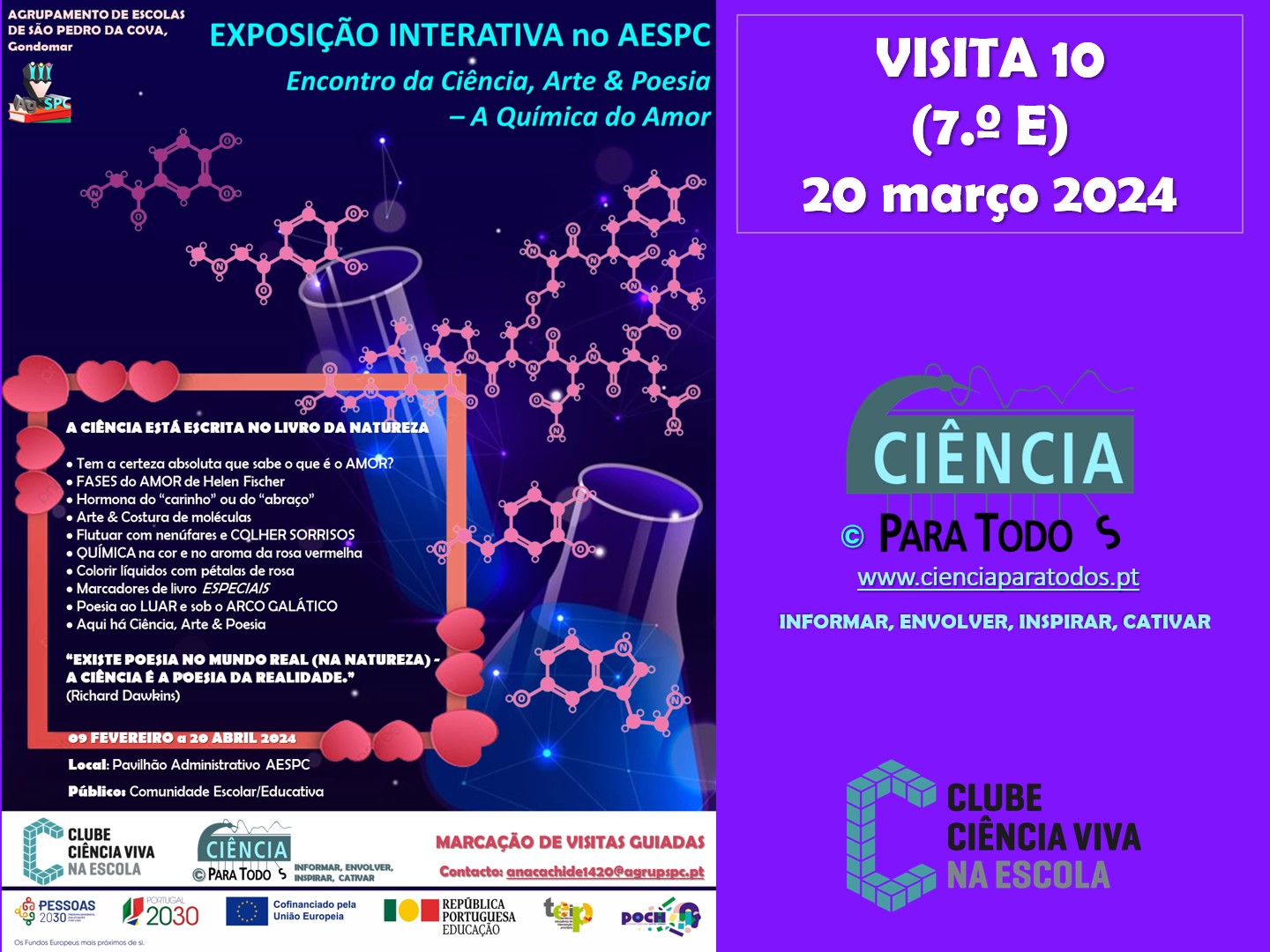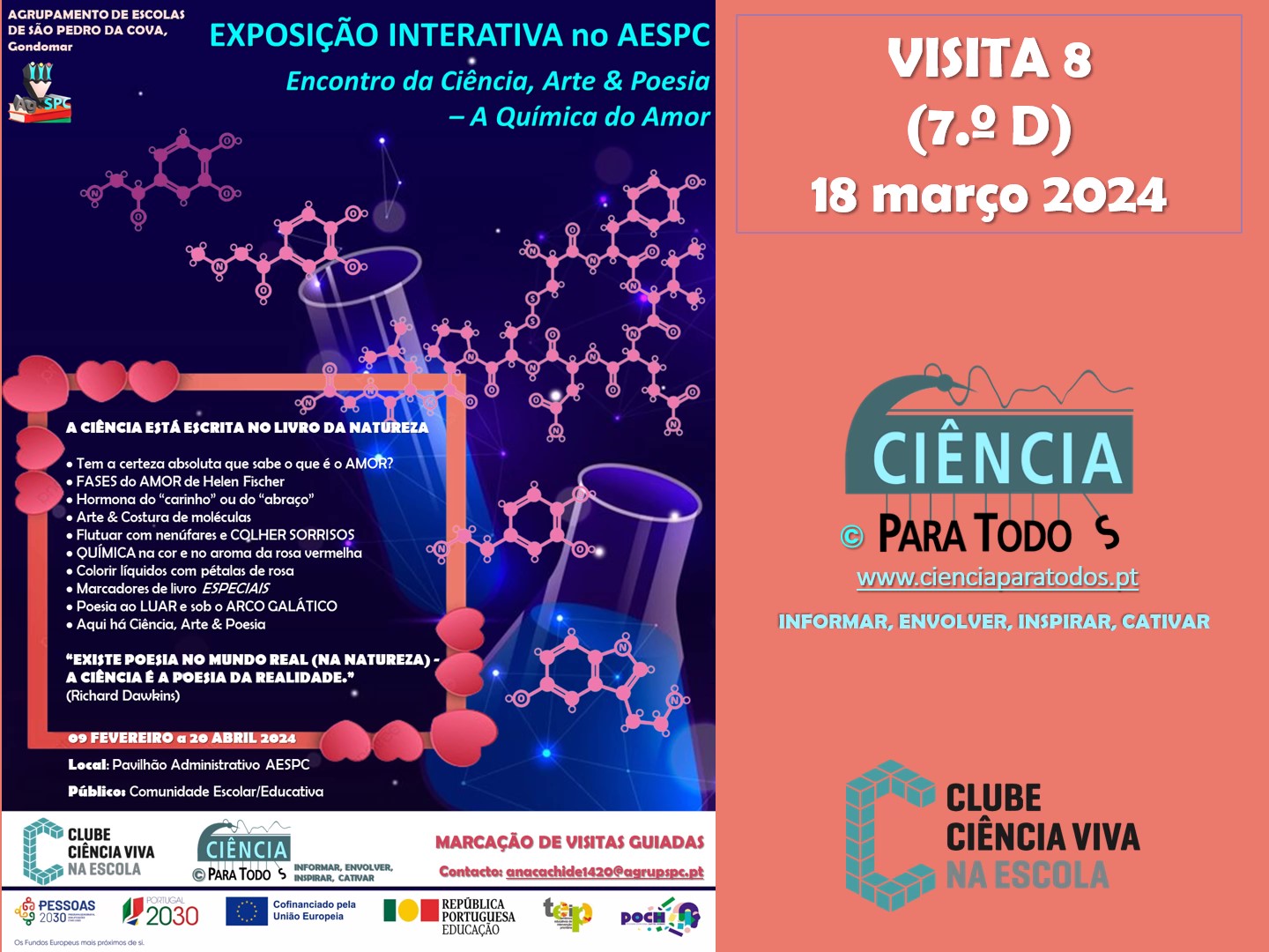 Visita dos alunos do 7.º E à Exposição “Encontro da CIÊNCIA, ARTE & POESIA - A Química do Amor” acompanhados pela Professora Ana Cachide. Esta exposição tem a mentoria e as ideias criativas e produtivas do PDC – CIÊNCIA PARA TODOS e reflete o pensamento poético do cientista Richard Dawkins (“existe poesia no mundo real (na natureza), a ciência é a poesia da realidade”), porque, de facto, a ciência está escrita no Livro da Natureza e a ciência também é feita de poesia!