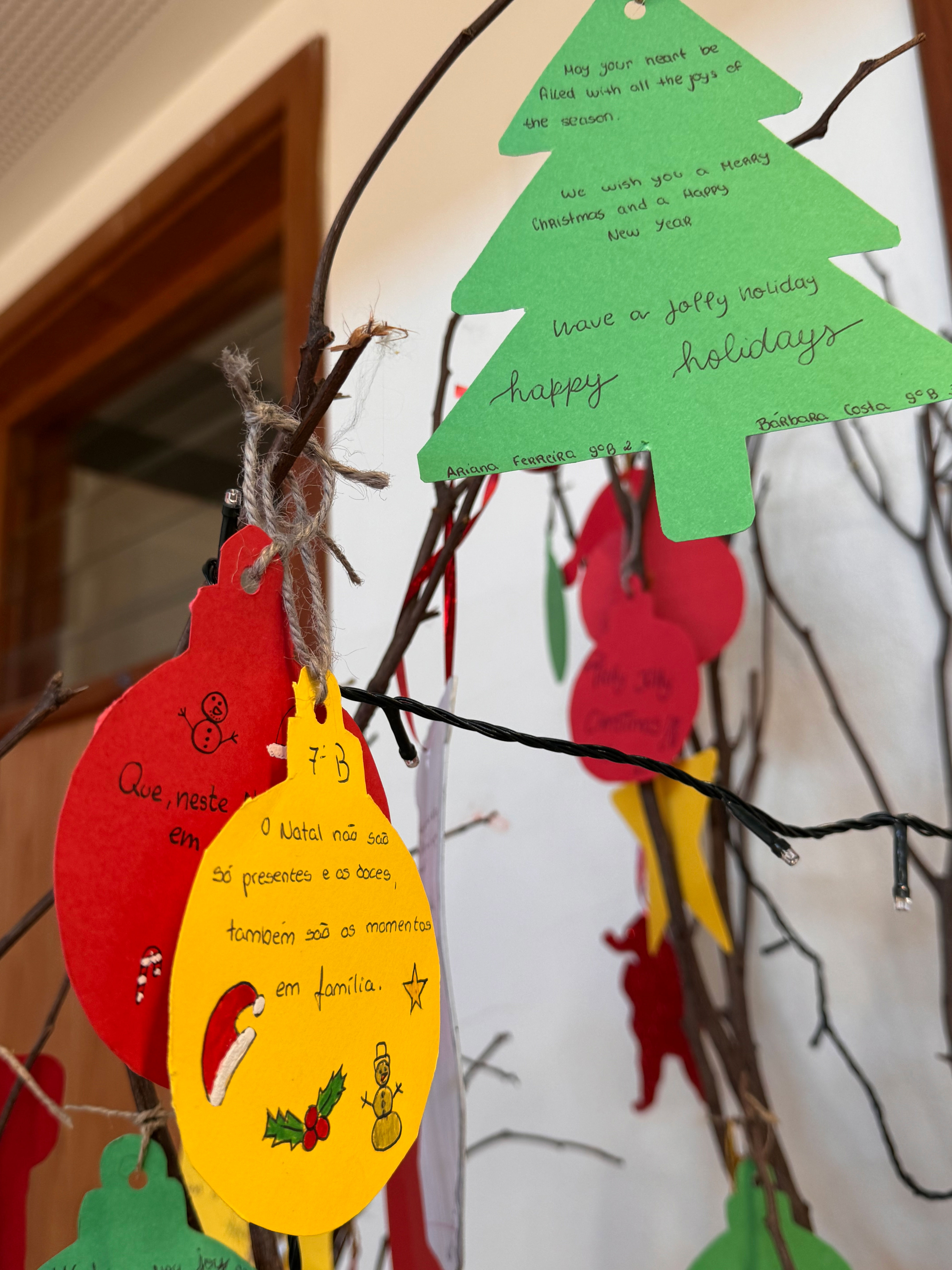 Ainda sobre o Natal… os alunos da Escola Básica de São Pedro da Cova participaram ativamente na decoração das árvores de Natal, numa atividade que aliou criatividade, partilha e aprendizagem. Os alunos escreveram mensagens de Natal em português, inglês e francês, contribuindo para um ambiente de diversidade linguística e cultural.