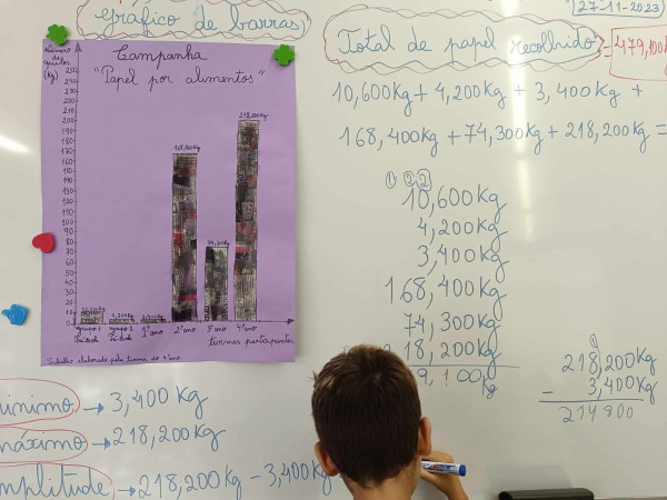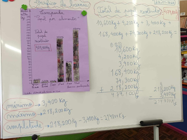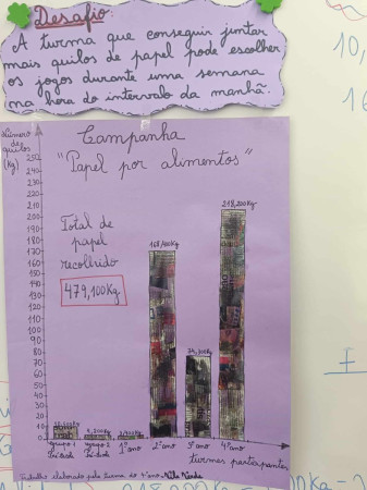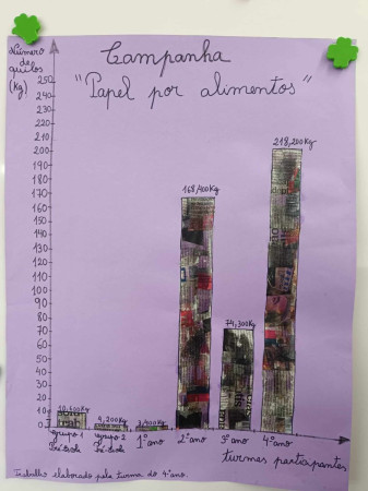 A turma do 4ºano foi responsável por pesar o papel em todas as salas e analisar os dados recolhidos. Procederam à elaboração de um cartaz com um gráfico de barras (construído com bocados de jornal) onde todos poderiam observar os resultados obtidos.