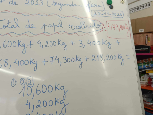 Verificou-se que a turma que angariou mais papel foi a turma do 4º ano com 218,200 kg. A escola juntou no total 479,100kg, que foi um resultado muito bom.