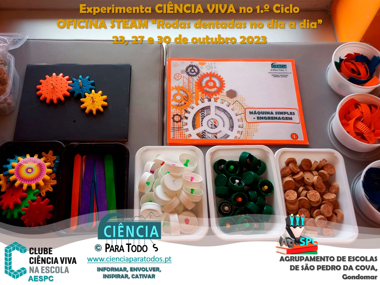 Foi neste contexto que os “Pequenos Cientistas” aguçaram a curiosidade, o entusiasmo e a vontade de saber mais com a realização da Oficina STEAM “Rodas dentadas no dia a dia”. Com materiais reutilizáveis e de baixo custo, cada aluno construiu um modelo de engrenagem de duas rodas dentadas para investigar o funcionamento básico deste mecanismo. Foram conversas deliciosas à volta das rodas dentadas! Duas rodas dentadas rodarão no mesmo sentido? Qual será a que roda mais depressa? Onde podemos encontrar rodas dentadas e engrenagens no nosso dia a dia? Para que servem estes órgãos mecânicos? As respostas prontas e curiosas, a alegria e o entusiasmo, a vontade de “fazer tudo bem” e de ultrapassar os desafios, marcaram o empenho destes “Pequenos Cientistas”. Os “Pequenos Cientistas” foram simplesmente fantásticos! Foi um gosto imenso fazer esta viagem com todos(as) e com cada um de vós. Obrigada, "Pequenos Cientistas! Obrigada, Professoras Luísa Afonso, Ana Cristina Neves, Ana Paula Santos, Carla e Evelina Meireles, e Alexandra Cardoso! Até à próxima viagem!