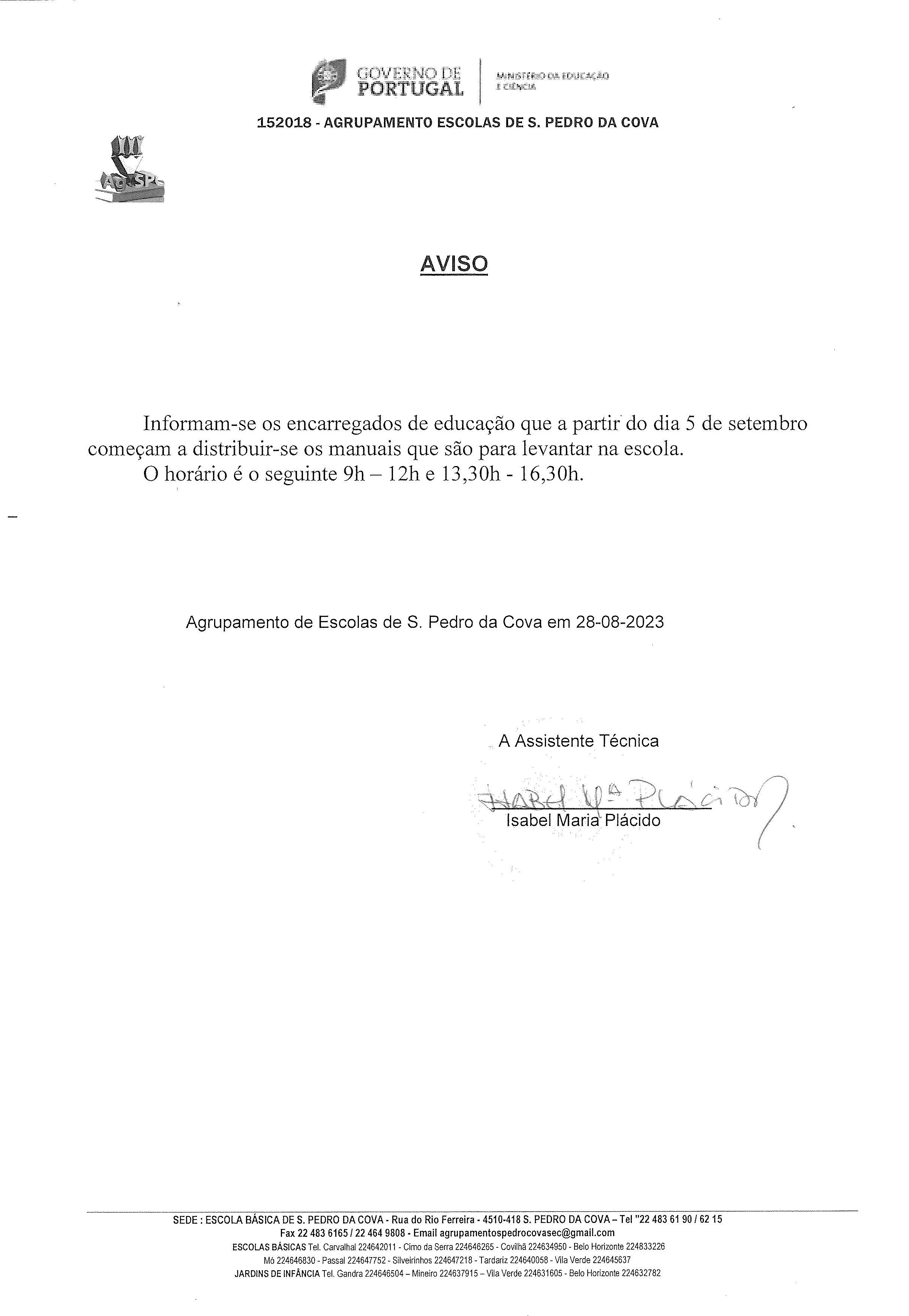 Avisam-se todos os alunos e Encarregados de Educação que a distribuição dos manuais reutilizáveis para o ano letivo 2023/2024 será efetuada, na escola sede, a partir do dia 5 de setembro e de acordo com o horário seguinte: 9:00 às 12:00; 13:30 às 16:30.