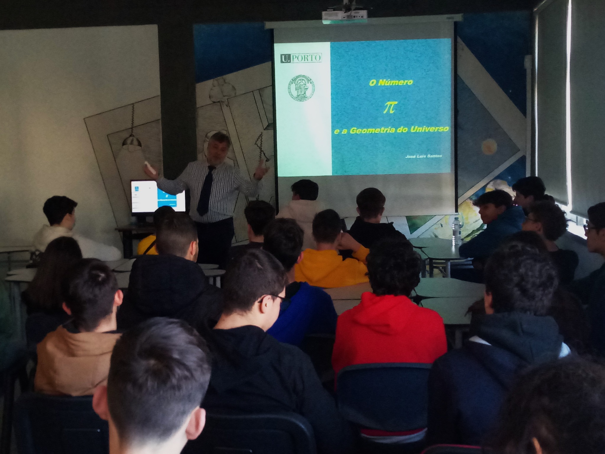 Neste dia tão especial da Matemática, o Clube Ciência Viva na Escola do AESPC "colocou na bagagem" um Físico da FCUP que gosta de "Conversas Matemáticas" e marcou um encontro com "Exploradores da Ciência" da Comunidade Escolar, na Biblioteca da Escola Sede. Alunos das turmas do 7ºF, 9ºC, 9ºD, 7ºA, 7ºB, 6ºF, 5ºE, 8ºA, 8ºE, 7ºC e 9ºA, estiveram à conversa com o Professor Doutor José Luís Santos da Faculdade de Ciências da Universidade do Porto (FCUP) sobre o número Pi e a geometria do Universo e sobre muitos outros temas.