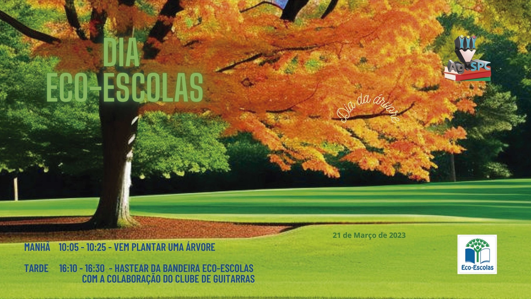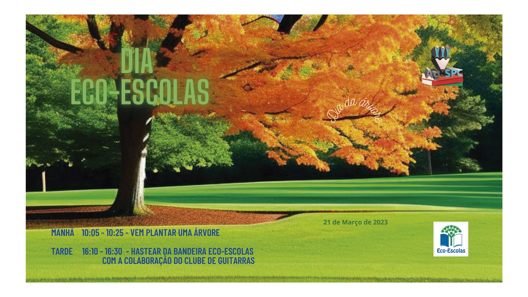 Convida-se toda a comunidade educativa a plantar uma árvore no dia 21 de março de 2023, na escola sede, pelas 10h05 e hastear, às 16h10, a bandeira da Eco-Escolas ao som do momento musical promovido pelo Clube de Guitarras.