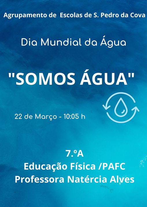 A turma A do 7º ano, juntamente com a Prof. Natércia tem o prazer de convidar toda a comunidade educativa para a apresentação da dança "Somos Água", no dia 22 de março, às 10:05h.