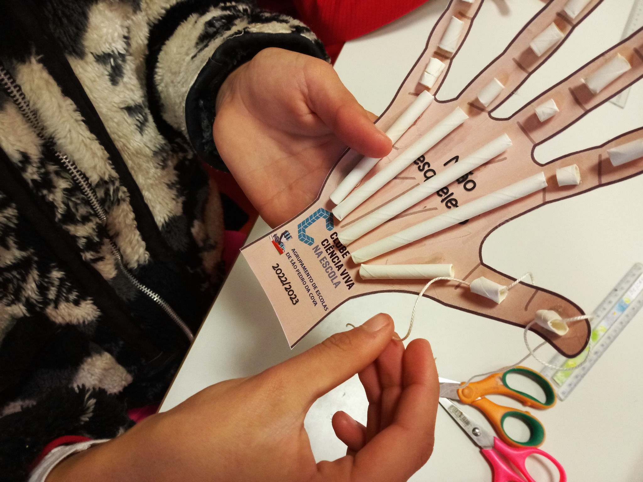 Nesta viagem, fizemos uma paragem mais demorada na mão humana. Afinal, o que temos dentro da nossa mão? Quais são os ossos da mão? E, quantos são? Muito bem! As respostas foram boas e a conversa foi bem interessante e repleta de entusiasmo. Agora, "mãos à obra"! Vamos construir um modelo do esqueleto da mão humana a partir de cartolina, fios e palhinhas de papel. Precisamos apenas de muita atenção, concentração, capacidade de observação, fazer medições com rigor, saber usar régua e tesoura, fazer colagens nos locais certos, ser criativo na resolução de algum problema que surja na construção, ser persistente e nunca desistir de um bom desafio! Afinal, neste modelo, o que representam as palhinhas, os fios e a cartolina? A "Mão esqueleto" funciona? Como funciona a mão humana? Qual a função dos dedos e a importância do polegar? Afinal, uma mão humana composta apenas por ossos não se pode mover!