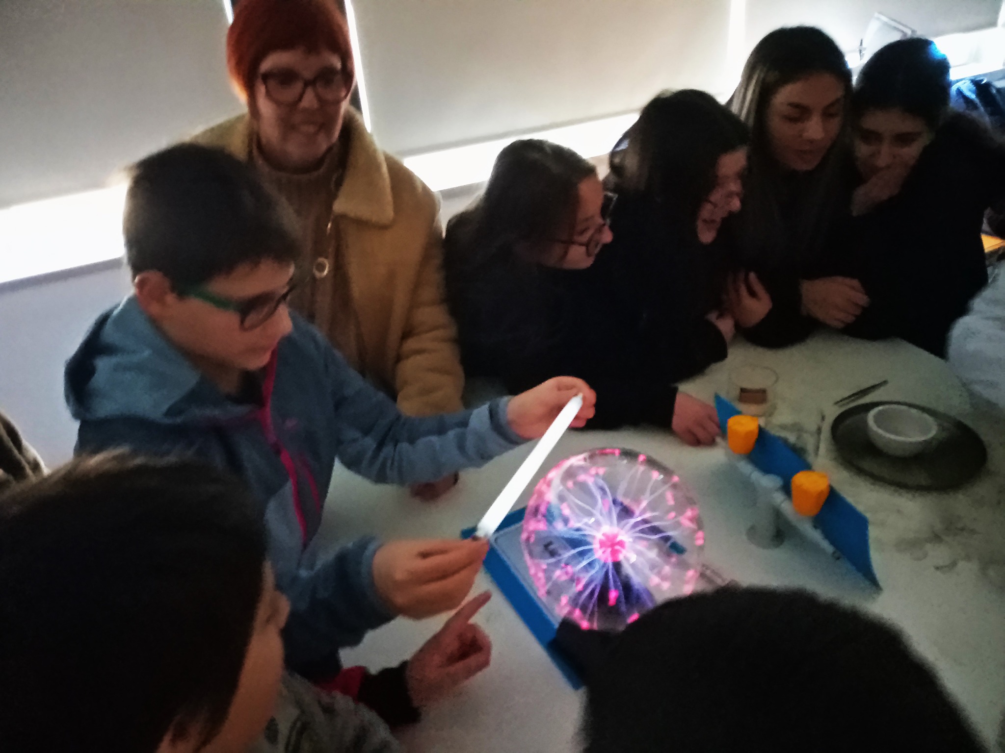 A tarde de 25 de janeiro foi colorida de Ciência, Tecnologia e Arte. A curiosidade e a alegria invadiram o Laboratório de Físico-Química! O público visitante (alunos da Unidade de Apoio Especializado com as Professoras Célia e Fernanda; alunos do 5ºE com a Professora Isabel; alunos do 7ºF com a Professora Elisabete) tinham à sua espera desafios elétricos, circuito elétrico humano, luz sem fios, lã de aço em chamas, atrai ou não atrai, ouriço magnético, forças invisíveis em ação, explosão de cores, projetor de estrelas, projetor de sombras, arte em projeção e muita animação num ambiente festivo onde os protagonistas foram o público desta Comunidade Escolar.