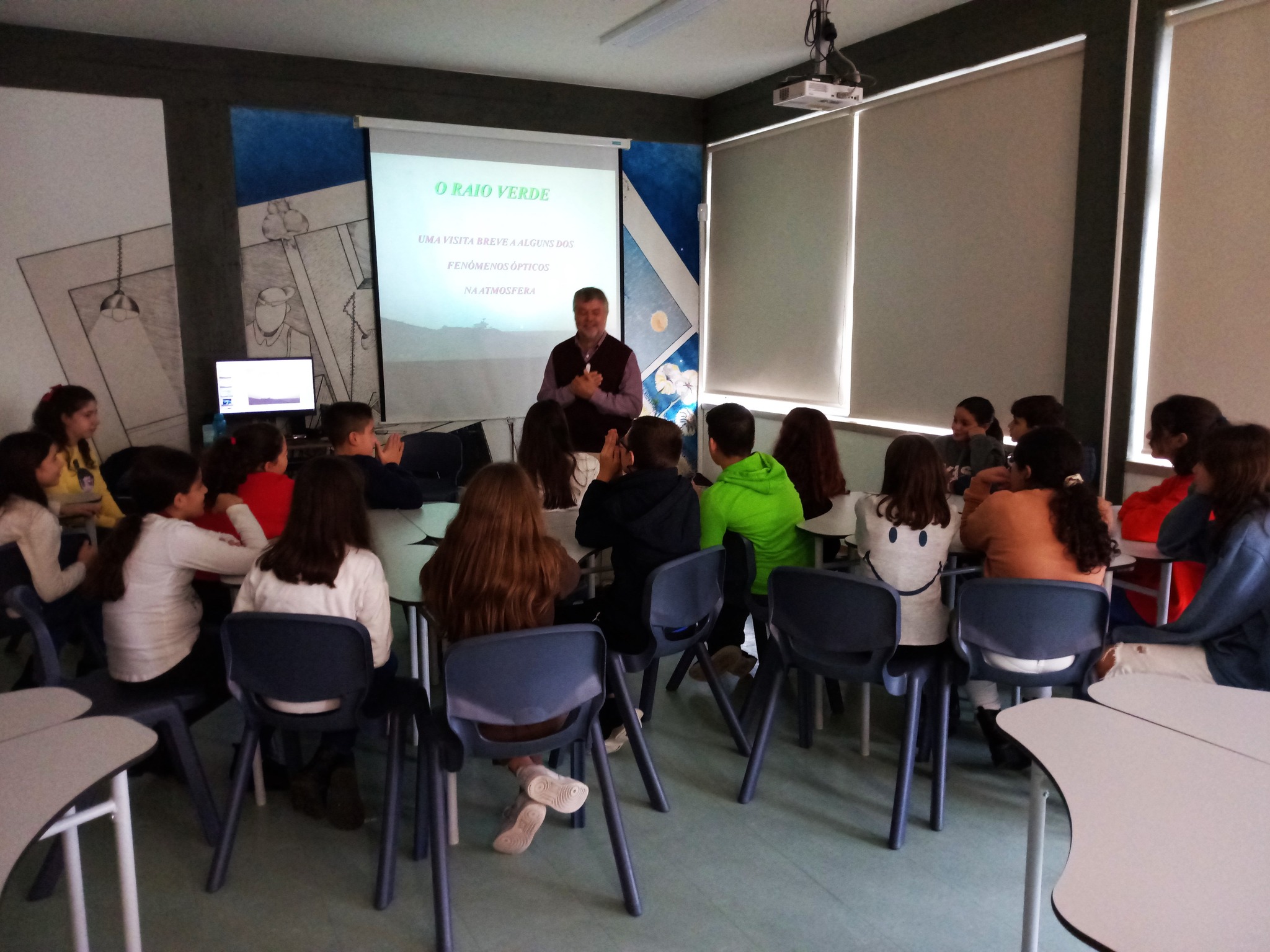 O Clube Ciência Viva na Escola do Agrupamento de Escolas de São Pedro da Cova está a celebrar com a Comunidade Escolar a Semana da C&T 2022. Durante a manhã de 23 de novembro recebemos um Cientista na nossa Escola. O Professor Doutor José Luís Santos da FCUP esteve à conversa sobre "O Raio Verde". Para onde nos levou? Fizemos uma "Visita a fenómenos óticos na atmosfera, do Paleolítico até à era moderna. O papel crucial da atmosfera como interface entre o Homem e o Cosmos. A Terra vista do Espaço. Por que é que o céu é azul? Por que é que as nuvens são brancas? Porque é que o Sol é vermelho no nascer e no ocaso? O arco-íris ou a ponte entre a poesia e a ciência. Padrões de luz em torno do Sol e da Lua. Raios crepusculares. A sombra da Terra. Auroras. Fenómenos elétricos na atmosfera. Miragens. O Raio Verde e a história bonita do romance de Júlio Verne." Foi uma manhã repleta de muita curiosidade, encanto e saber por fascinantes fenómenos óticos na atmosfera.