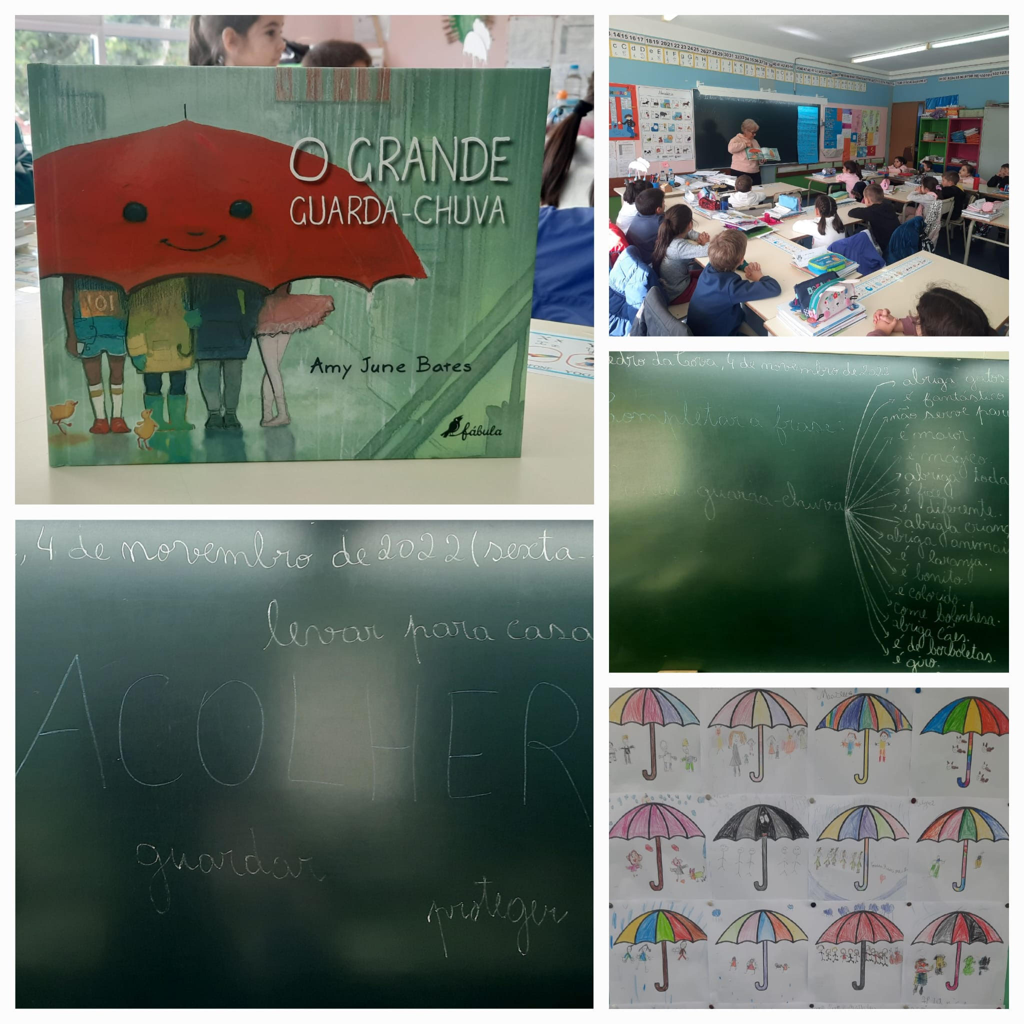 Foi ainda pedido completassem a frase: O meu guarda-chuva é… e foi feito o registo das frases no quadro.