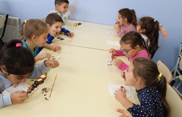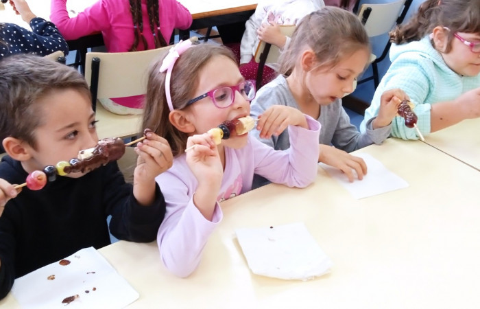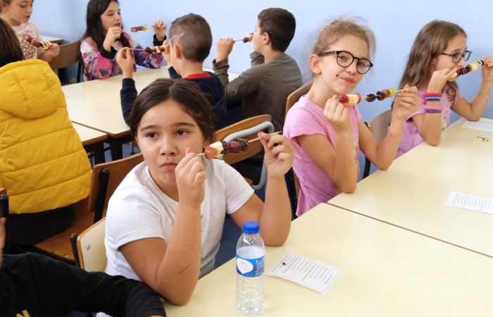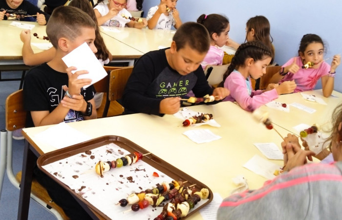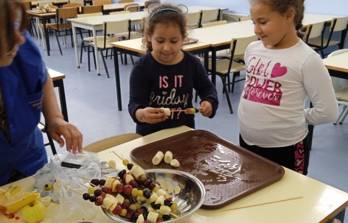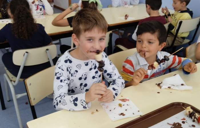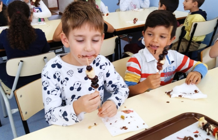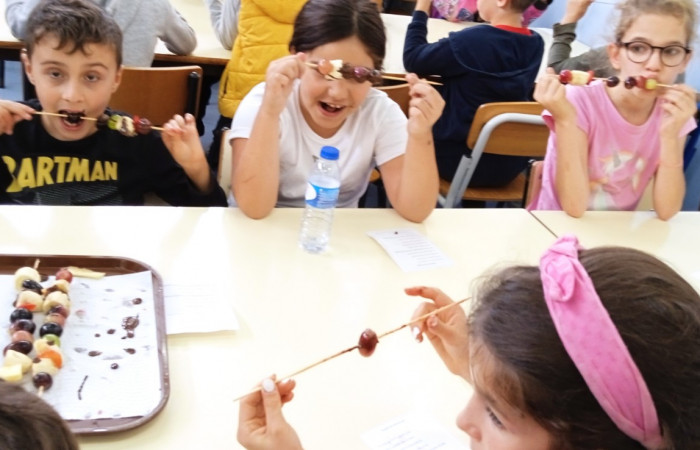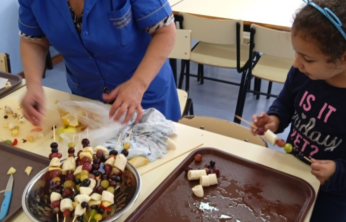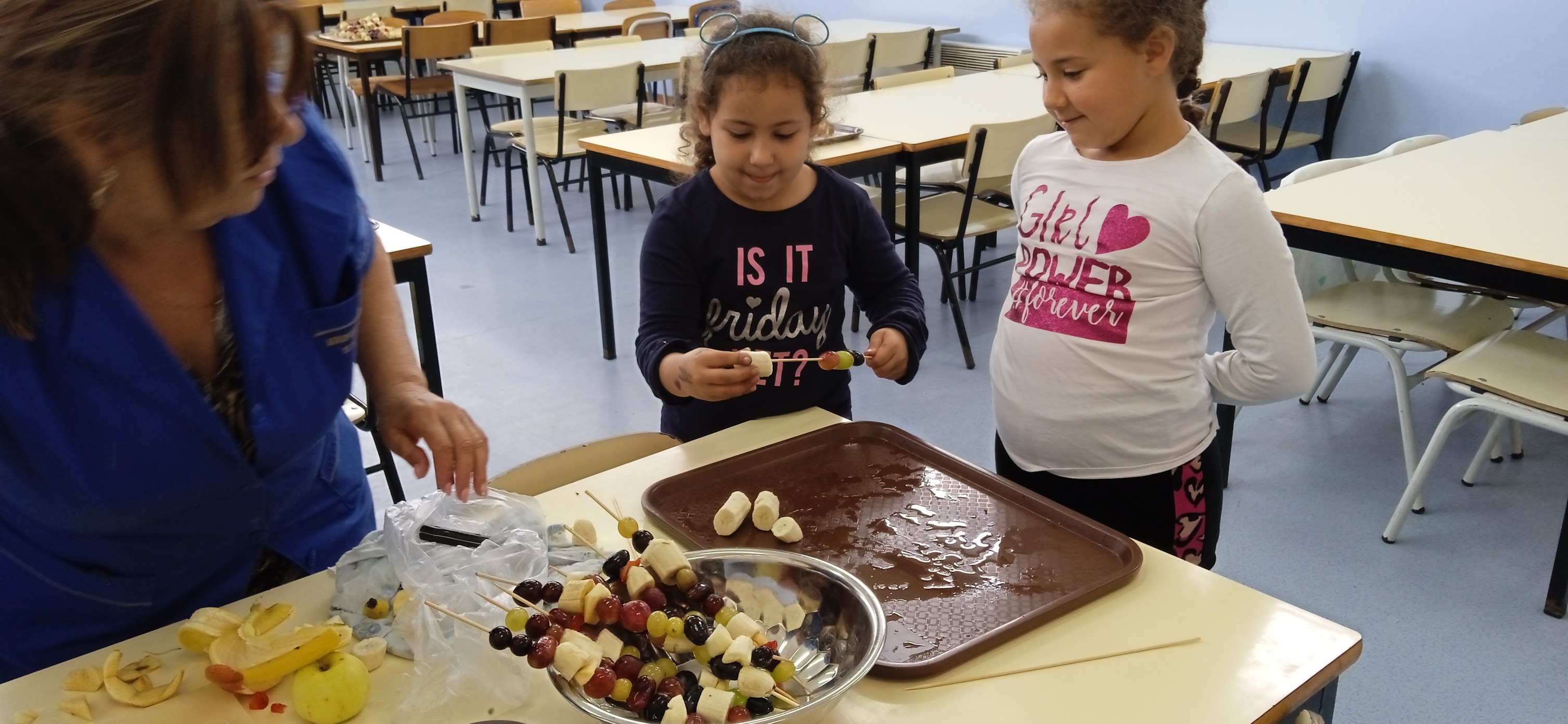 A escola decidiu comemorar o Dia Mundial da Alimentação (16 de outubro), no dia 14 de outubro, com a elaboração de umas deliciosas e apetitosas espetadas de fruta.
