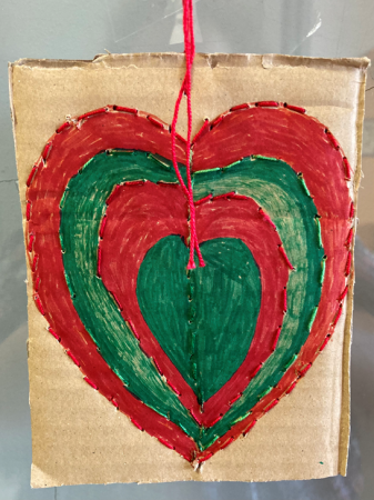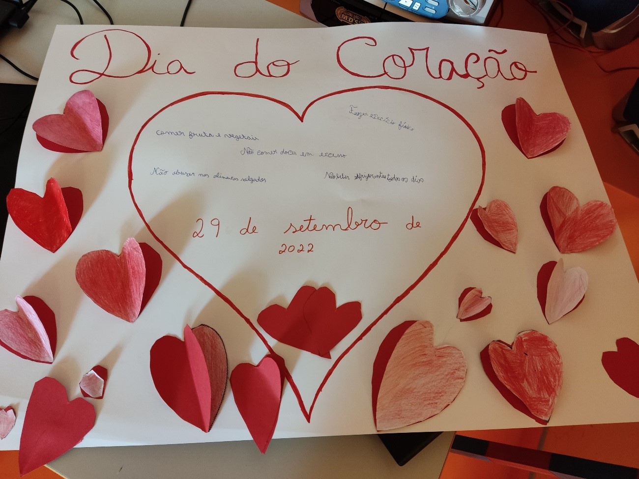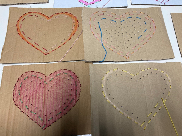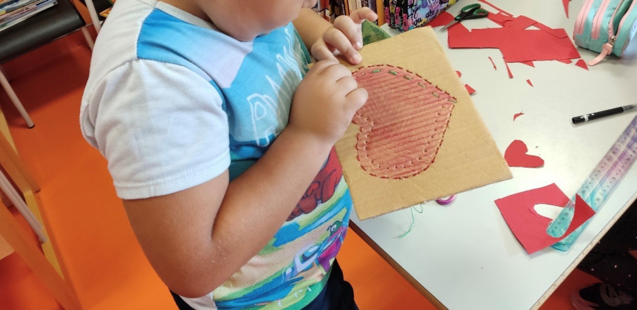 Na véspera, alguns alunos tinham ensaiado já na biblioteca, a confeção de corações bordados em cartão, reutilizando materiais. Este trabalho foi concluído com a intervenção da turma de Educação e Formação de Adultos e os diversos corações foram afixados nas portas das salas de aula da escola.