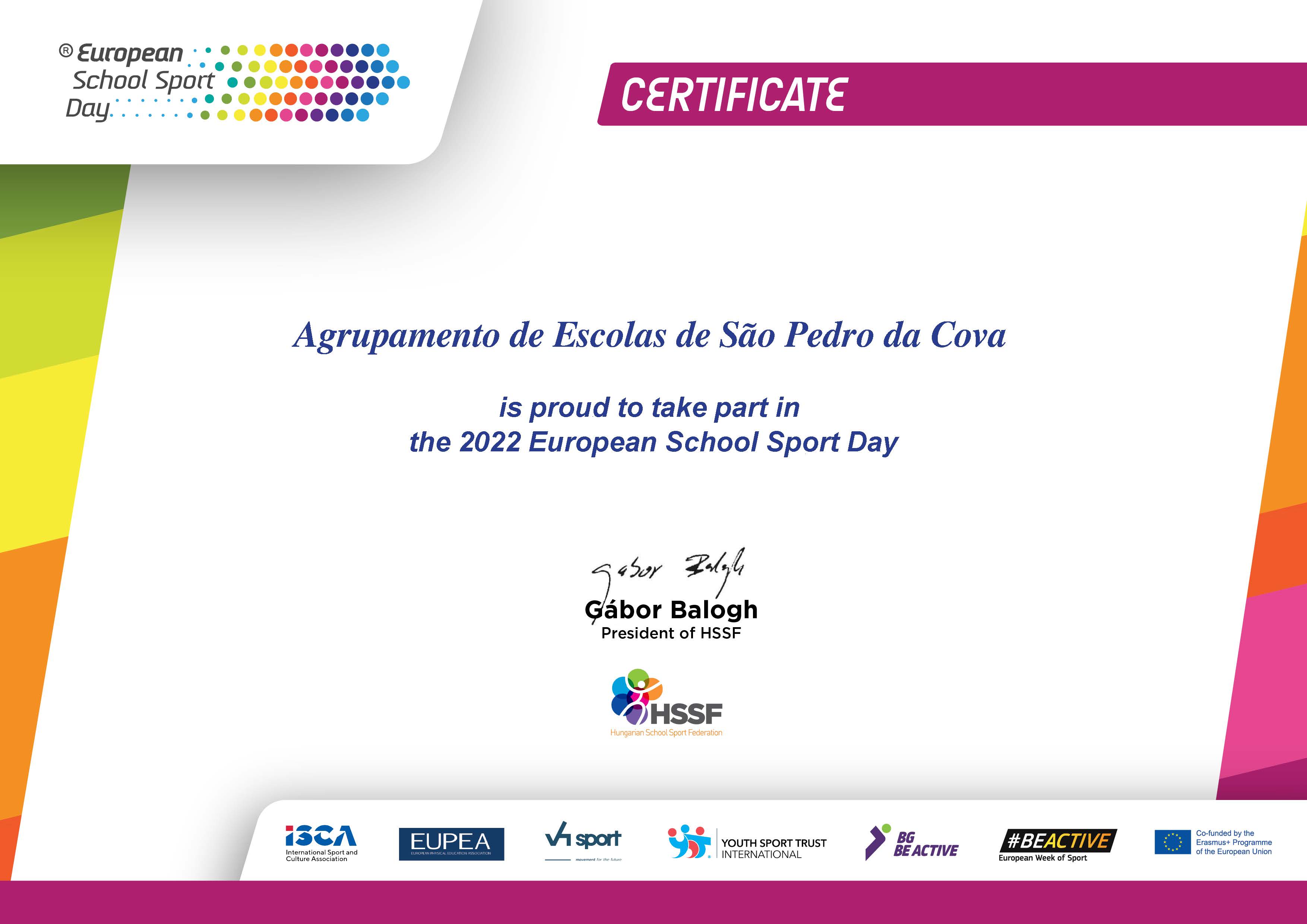 No último dia de participação na Semana Europeia do Desporto na Escola, pelas evidências de todas as atividades realizadas durante a semana, o nosso agrupamento foi reconhecido com um certificado de participação emitido pela Federação Húngara de Desporto Escolar (Hungarian School Sport Federation - HSSF). Fundada em 1987, a federação é considerada a maior organização civil nas áreas do desporto e educação juvenil na Hungria. Entretanto, a HSSF conseguiu construir um novo evento pan-europeu com base no Dia do Desporto Escolar Húngaro, que ‒ desde 2017 ‒ é um evento chave da Campanha Now We Move da ISCA e da Semana Europeia do Desporto, a iniciativa do Comissão Europeia. Em 2018, a HSSF e os seus parceiros chegaram a 30 países europeus com o European School Sport Day ® (ESSD) e estão empenhados em desenvolver ainda mais o programa a nível internacional nos próximos anos.