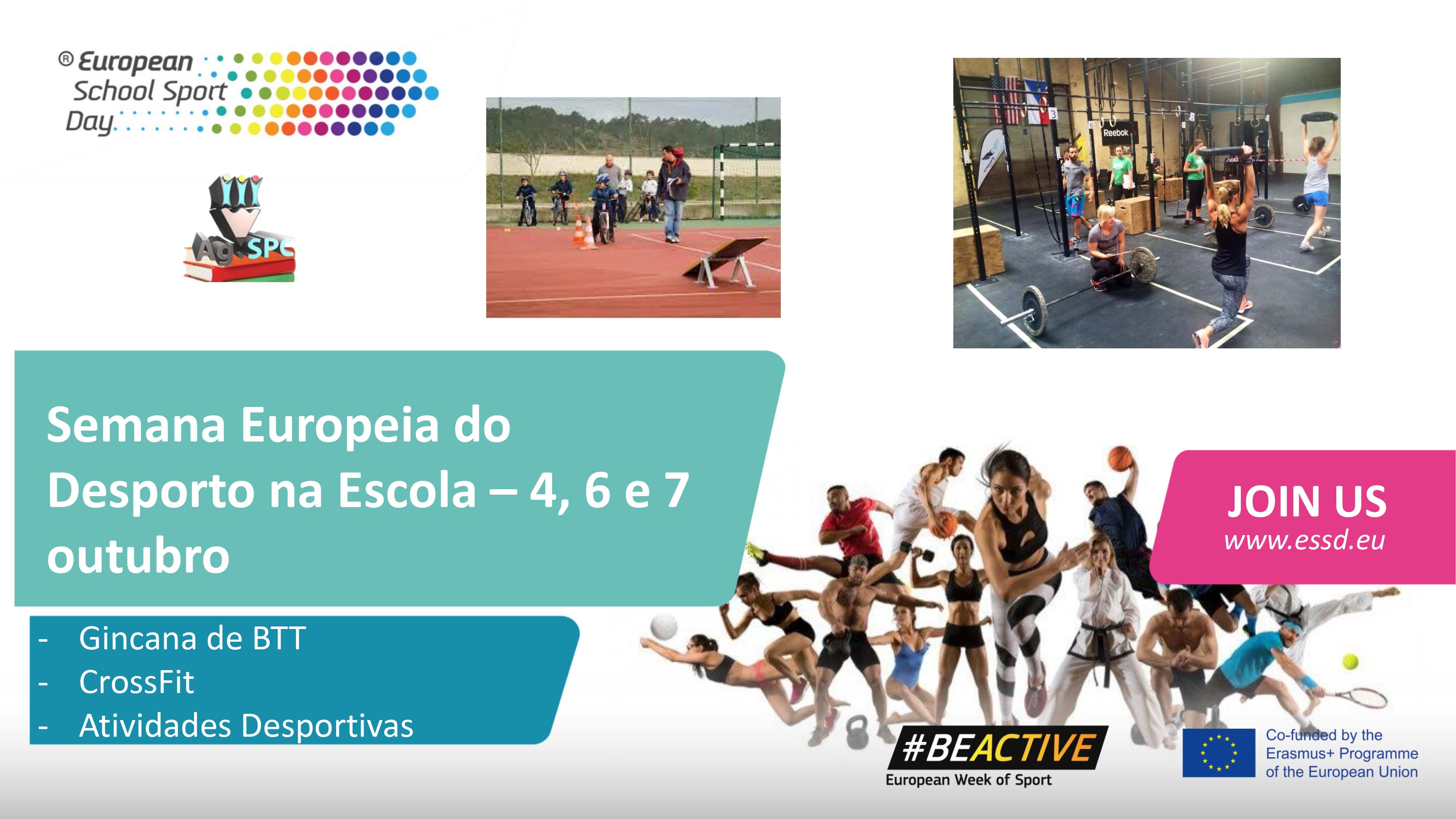Informa-se toda a comunidade educativa que nos dias 4, 6 e 7 de outubro irão realizar-se várias atividades, promovidas pelo grupo de Educação Física, no âmbito da Semana Europeia do Desporto.