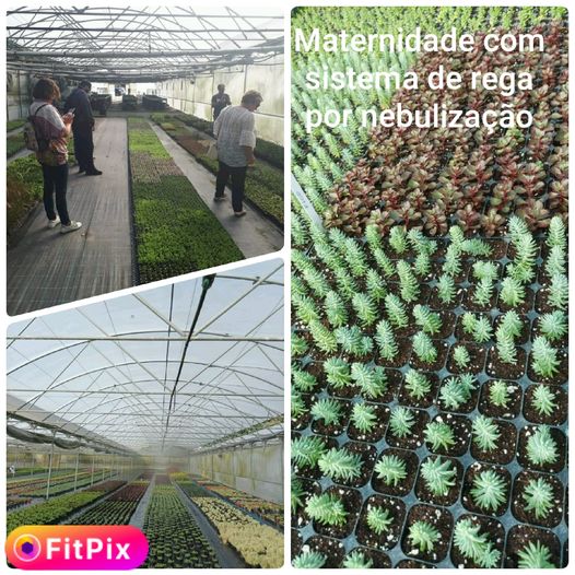 A visita foi iniciada numa parte da estufa chamada de “Maternidade”, onde as plantas são propagadas e ficam algum tempo até enraizar. Aqui o sistema de rega é feito com pulverizadores automatizados que nebulizam as plantas, colocadas em tabuleiros com alvéolos.