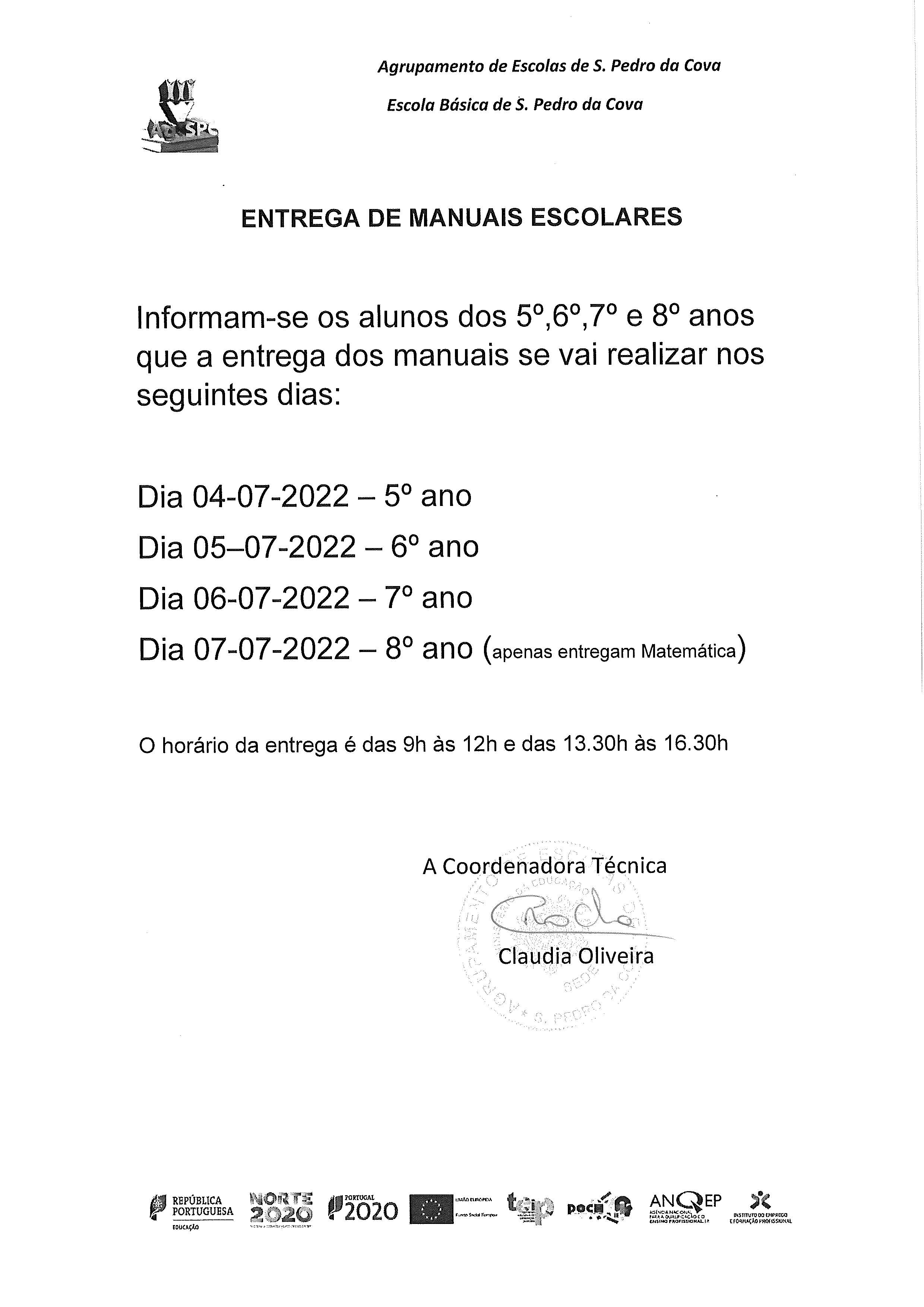 Informam-se os alunos dos 5.º, 6.º, 7.º e 8.º anos que a devolução dos manuais irá realizar-se nos seguintes dias: