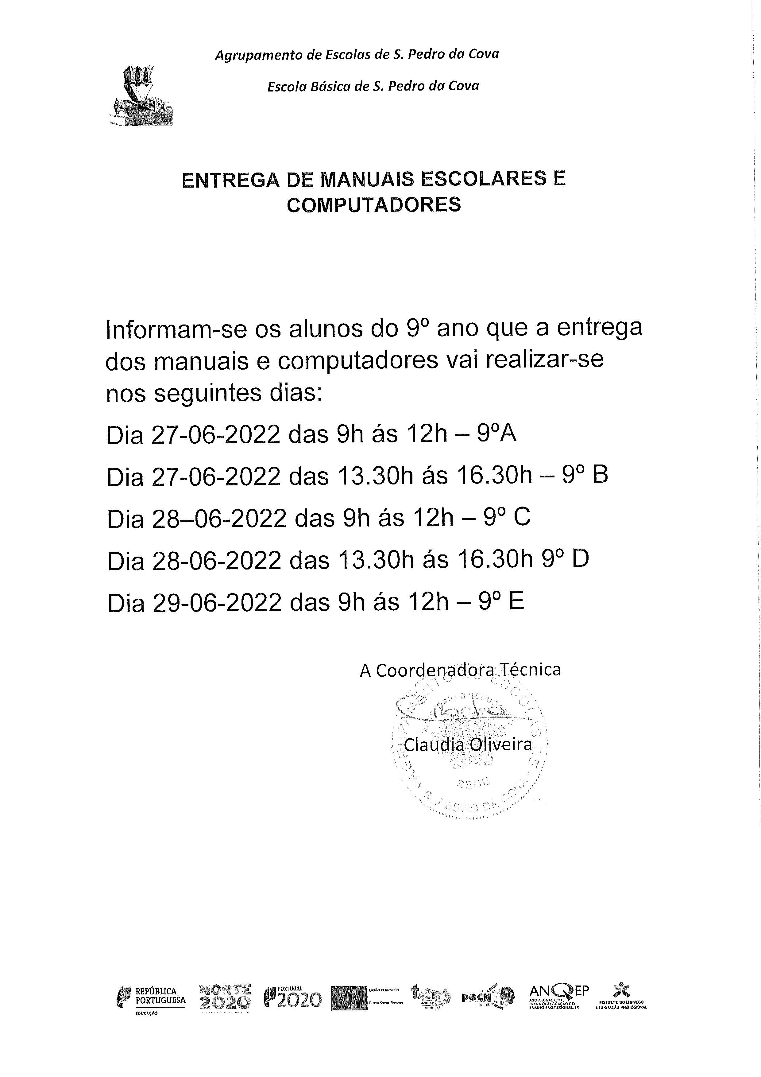 Informam-se os alunos do 9° ano que terão de efetuar a devolução dos manuais e computadores/internet de acordo com o calendário abaixo definido: