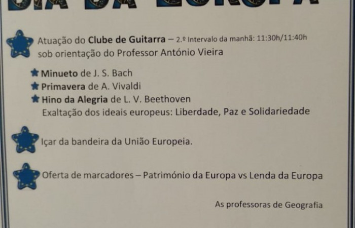Este evento contou com a atuação do Clube de Guitarra, sob orientação do Professor António Vieira, com um almoço (cantina) e lanche temáticos, com a exposição de diferentes bandeiras da Europa no jardim da escola e com a distribuição de marcadores à comunidade educativa.