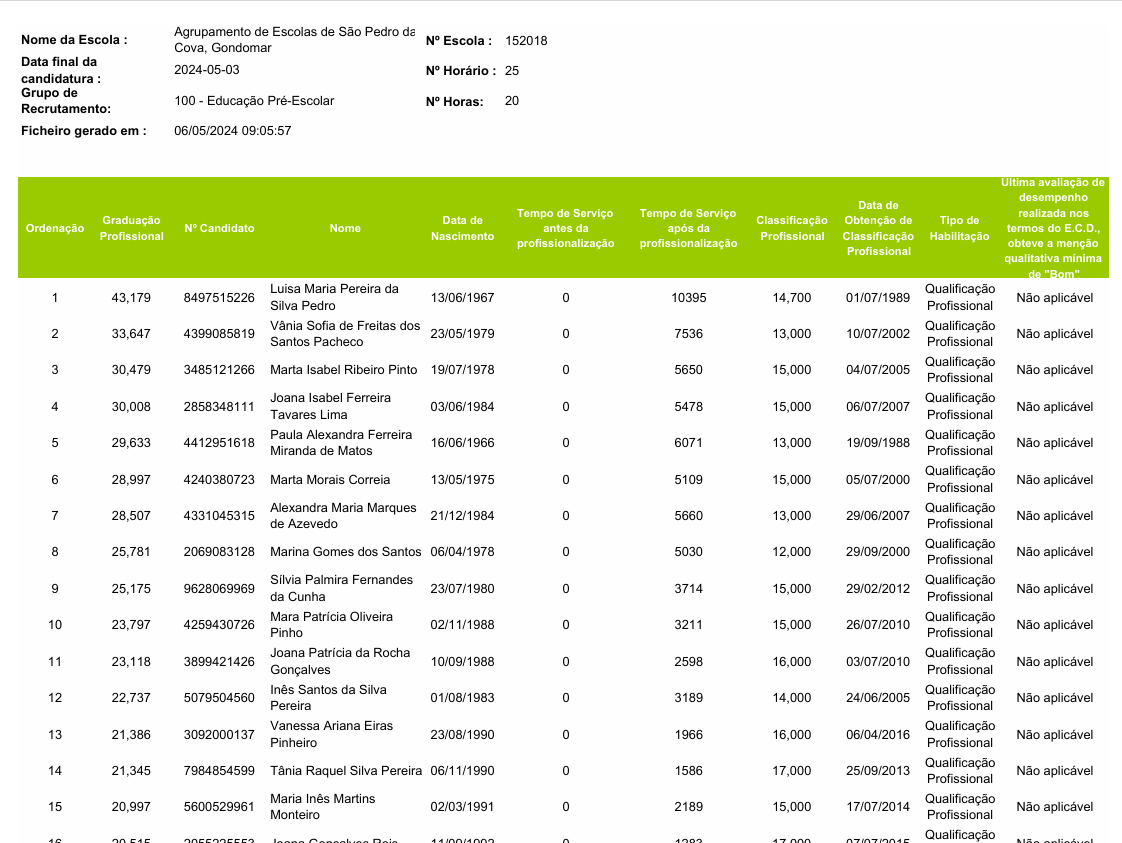 Já se encontram disponíveis as listas ordenadas de graduação para o grupo Educação Pré-Escolar - 100 (horários 24 e 25).
