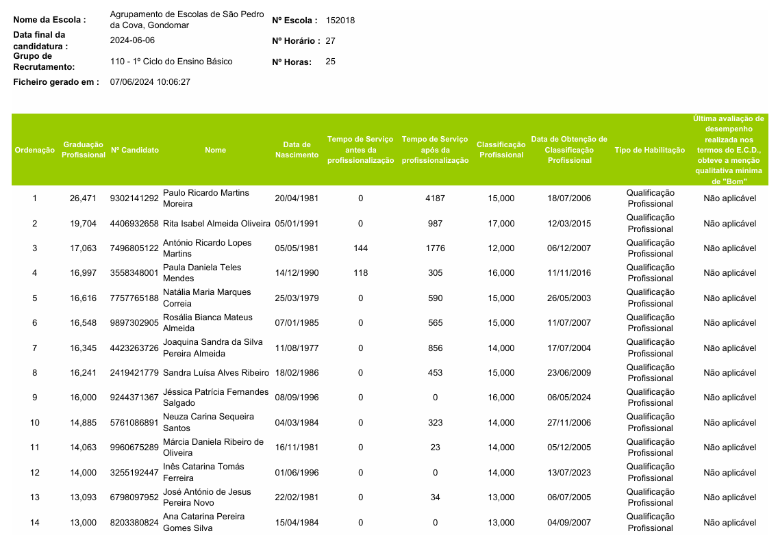 Já se encontra disponível a lista ordenada de graduação para o grupo 1.º Ciclo - 110 (horário 27).
