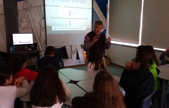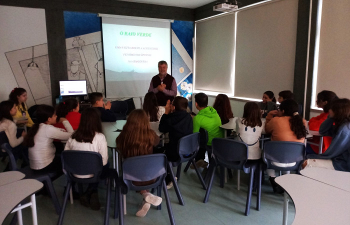 O Clube Ciência Viva na Escola do Agrupamento de Escolas de São Pedro da Cova está a celebrar com a Comunidade Escolar a Semana da C&T 2022. Durante a manhã de 23 de novembro recebemos um Cientista na nossa Escola. O Professor Doutor José Luís Santos da FCUP esteve à conversa sobre "O Raio Verde". Para onde nos levou? Fizemos uma "Visita a fenómenos óticos na atmosfera, do Paleolítico até à era moderna. O papel crucial da atmosfera como interface entre o Homem e o Cosmos. A Terra vista do Espaço. Por que é que o céu é azul? Por que é que as nuvens são brancas? Porque é que o Sol é vermelho no nascer e no ocaso? O arco-íris ou a ponte entre a poesia e a ciência. Padrões de luz em torno do Sol e da Lua. Raios crepusculares. A sombra da Terra. Auroras. Fenómenos elétricos na atmosfera. Miragens. O Raio Verde e a história bonita do romance de Júlio Verne." Foi uma manhã repleta de muita curiosidade, encanto e saber por fascinantes fenómenos óticos na atmosfera.