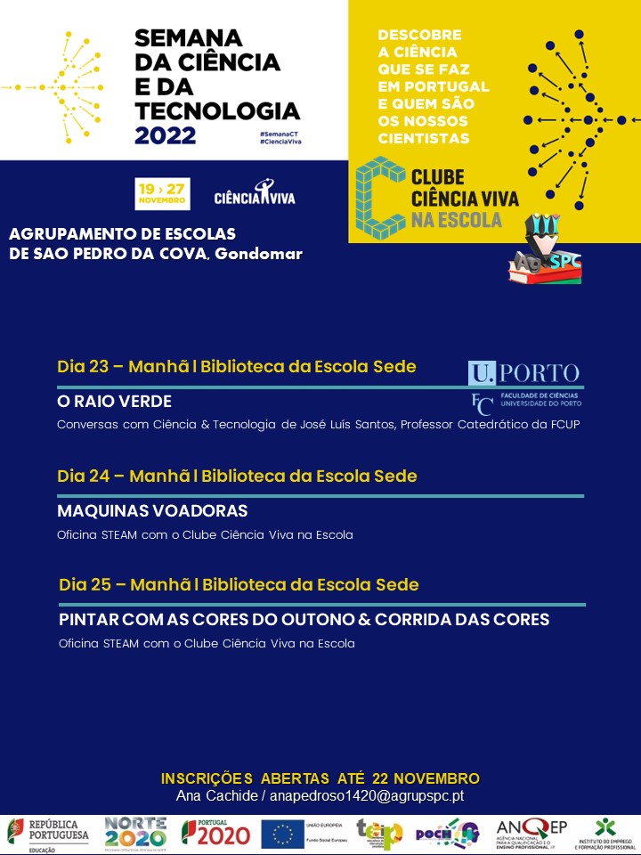 O CLUBE CIÊNCIA VIVA NA ESCOLA do Agrupamento de Escolas de São Pedro da Cova (AESPC) associa-se a esta celebração da Ciência e da Tecnologia com o Físico José Luís Santos da FCUP que estará à conversa sobre "O Raio Verde". Com as Oficinas STEAM não faltarão “corridas de moléculas", muita criatividade para pintar com as cores do outono e construções de planadores para saber como voam os aviões.
