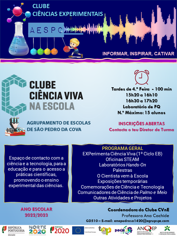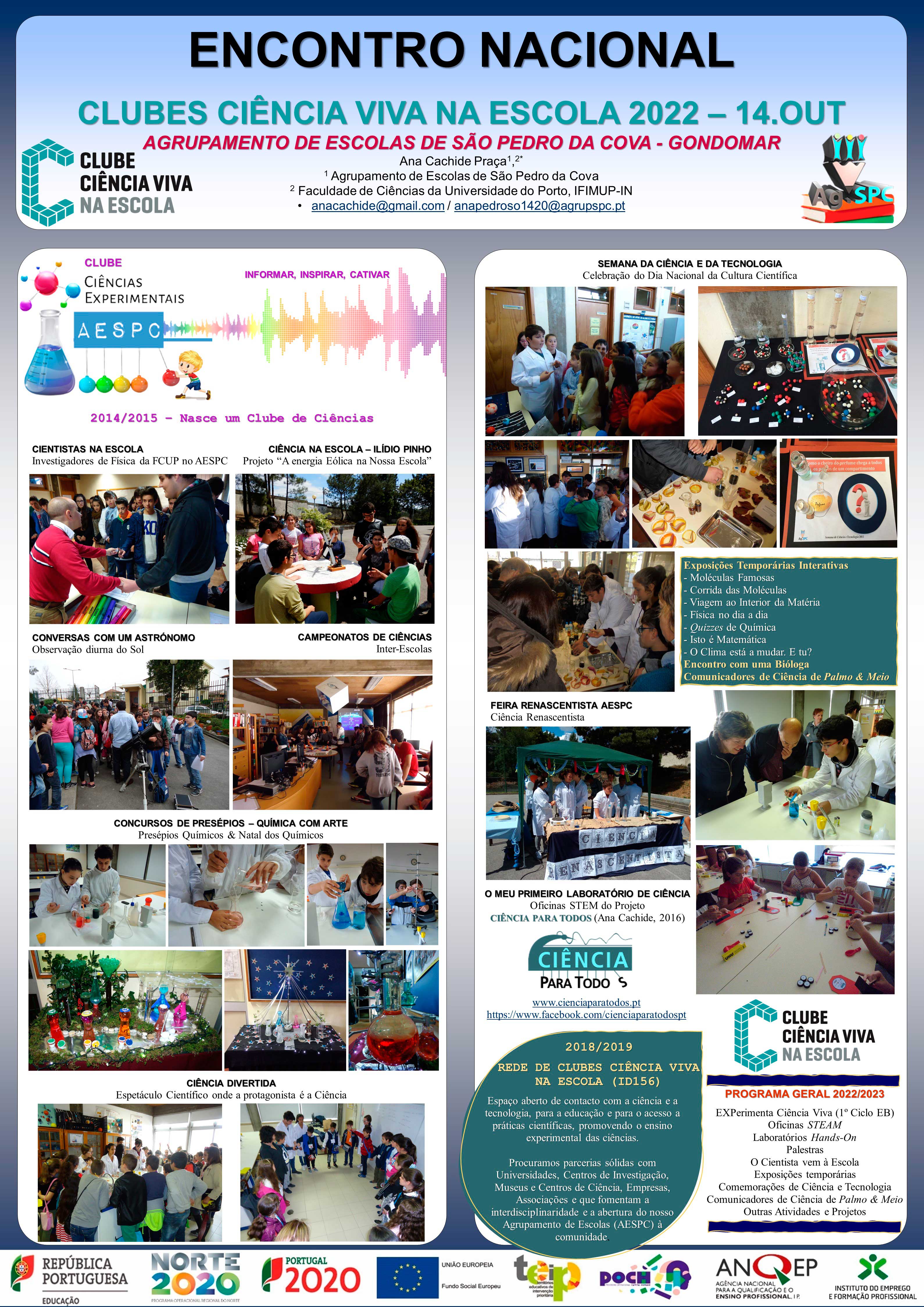 O Clube Ciência Viva na Escola do Agrupamento de Escolas de São Pedro da Cova (AESPC) está a participar no ENCONTRO NACIONAL DE CLUBES CIÊNCIA VIVA NA ESCOLA 2022, a decorrer hoje (14 de outubro) no Pavilhão do Conhecimento – Centro Ciência Viva, em Lisboa. Os Clubes Ciência Viva na Escola (Clubes CVnE) são promovidos pela Ciência Viva - Agência Nacional para a Cultura Científica e Tecnológica (CV-ANCCT) e a Direção-Geral de Educação (DGE). O Encontro Nacional de Clubes CVnE 2022 promove uma Mostra de Ciência e Tecnologia para Estabelecimento de Parcerias. Instituições científicas, empresas, museus e centros de ciência dão a conhecer o trabalho que desenvolvem promovendo uma oportunidade única para criar parcerias com os Clubes Ciência Viva na Escola. Na área expositiva do Pavilhão do Conhecimento os Clubes apresentam-se sob a forma de posters digitais. Na Sessão de Boas-vindas, Rosalia Vargas (Presidente da CV-ANCCT), José Vitor Pedroso (Direção-Geral da Educação) e Mário Tavares da Silva (Vice-Presidente da Estrutura de Missão Recuperar Portugal) apresentam o Programa Clubes CVnE. A Sessão das Intervenções Convidadas está a cargo de Agueda Gras-Velasquez (Diretora do Programa Ciência na European Schoolnet - EUN) e de Alexandre Quintanilha (Presidente da Comissão Parlamentar de Educação e Ciência). Agueda Gras-Velasquez é doutorada em Astrofísica e responsável pela coordenação dos representantes dos Ministérios da Educação na EUN, onde coordena todos os projetos educativos nas áreas STEM. Alexandre Quintanilha é doutorado em Física Teórica e Fundador do Instituto de Biologia Molecular e Celular. Presidiu à comissão para a criação do maior consórcio de investigação nacional na área da saúde – i3S. É membro de várias academias internacionais e presidiu a comités da Comissão Europeia e de outras organizações internacionais de investigação. É atualmente deputado e Presidente da Comissão Parlamentar de Educação e Ciência. A Sessão da Decisão Política nos Clubes CvnE deste Encontro Nacional de Clubes é um espaço de intervenção de Elvira Fortunato (Ministra da Ciência, Tecnologia e Ensino Superior) e de João Costa (Ministro da Educação), aos Coordenadores dos Clubes CVnE participantes e presentes neste evento organizado pelo Pavilhão do Conhecimento, em Lisboa.