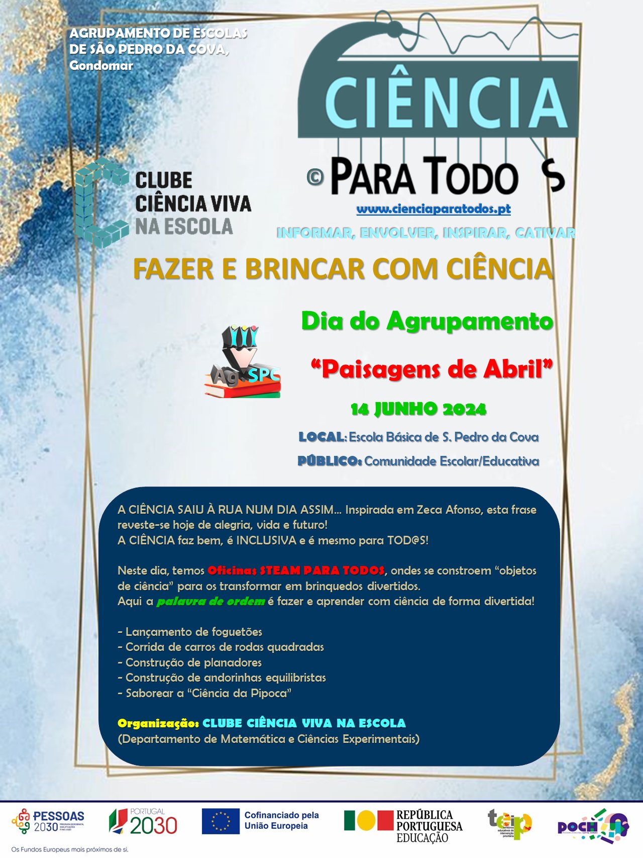 A CIÊNCIA SAIU À RUA NUM DIA ASSIM... Inspirada em Zeca Afonso, esta frase reveste-se hoje de alegria, vida e futuro! A CIÊNCIA faz bem, é INCLUSIVA e é mesmo para TOD@S! Os "Objetos de Ciência" do Projeto de Divulgação Científica - CIÊNCIA PARA TODOS continuam a sua caminhada pela ciência e tecnologia para todos no Clube Ciência Viva na Escola do AESPC, juntando-se às atividades celebrativas do “Dia do Agrupamento”.