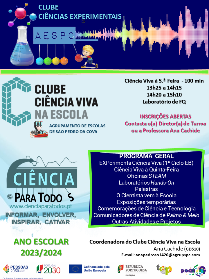 O Clube Ciência Viva na Escola (Clube CVnE) do AESPC integra a Rede de Clubes Ciência Viva Nacional, desde a 1.ª Edição lançada pelo Pavilhão do Conhecimento – Centro Ciência Viva, e assume-se como um espaço não formal de contacto com a ciência e a tecnologia, para a educação e para o acesso a práticas científicas inovadoras, promovendo o ensino experimental das ciências e a literacia científica. Nesse sentido, funciona na nossa escola como uma ferramenta/recurso de apoio às práticas letivas e não letivas do AESPC, sempre que se proporciona no trabalho natural dos docentes e até do próprio Agrupamento.
